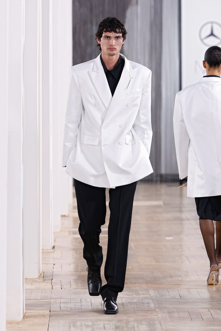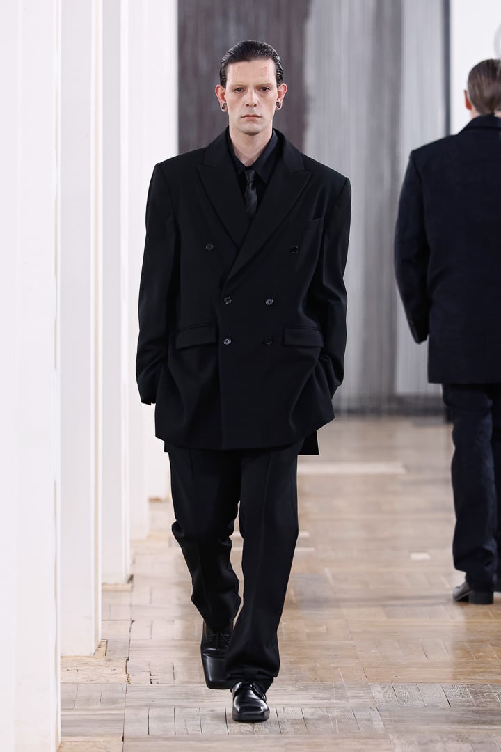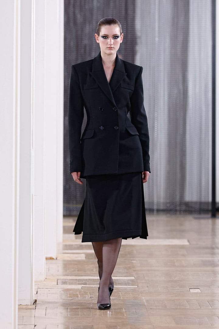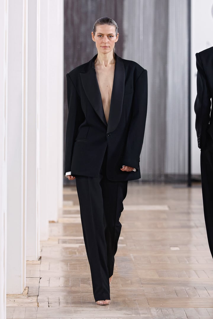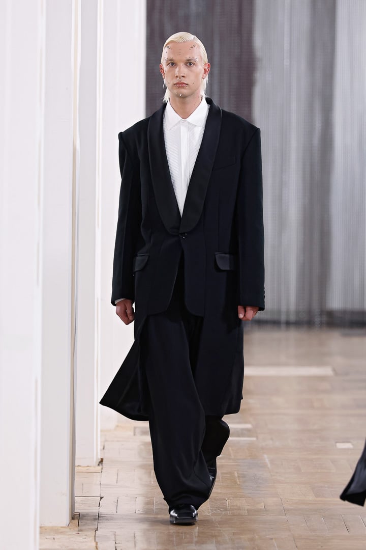 Likewise, a similar double-breasted blazer with a nipped-in waist is worn by a male model, complemented by a full-length skirt. The shape is the focal point, and it demands that we reconsider what exactly a power suit is. Make no mistake, the waist on this piece isn’t simply cinched in with a belt, either: It’s tailored into a curve that would make an Edwardian socialite’s mouth water.