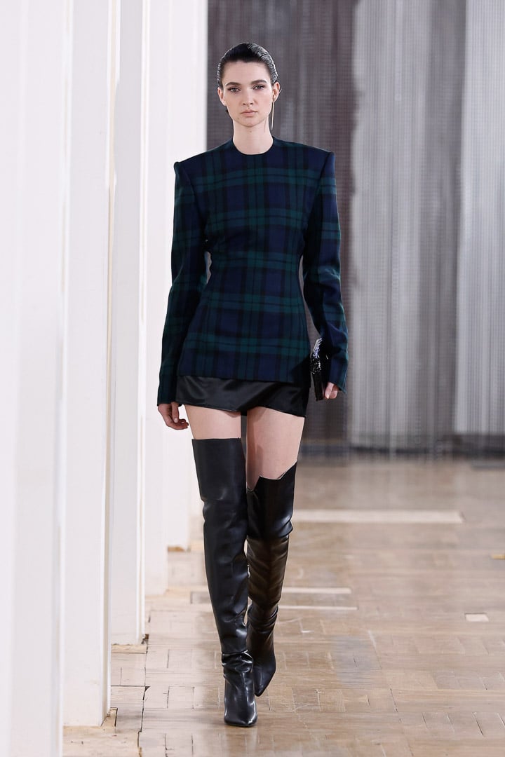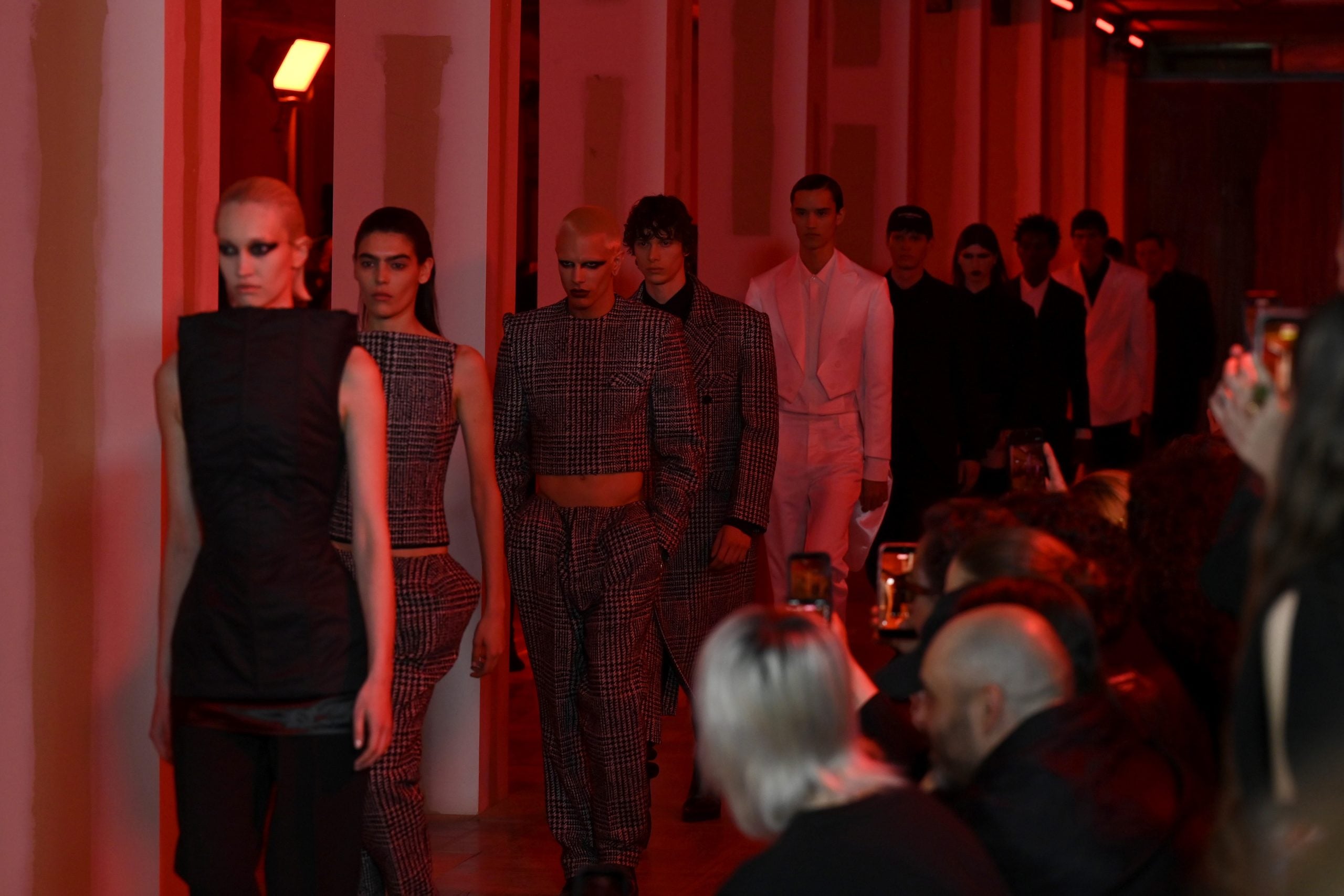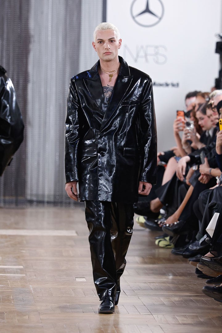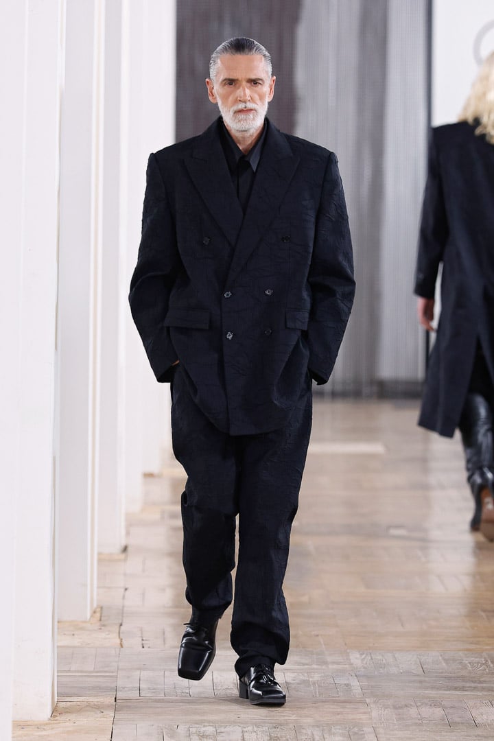 Likewise, a similar double-breasted blazer with a nipped-in waist is worn by a male model, complemented by a full-length skirt. The shape is the focal point, and it demands that we reconsider what exactly a power suit is. Make no mistake, the waist on this piece isn’t simply cinched in with a belt, either: It’s tailored into a curve that would make an Edwardian socialite’s mouth water.