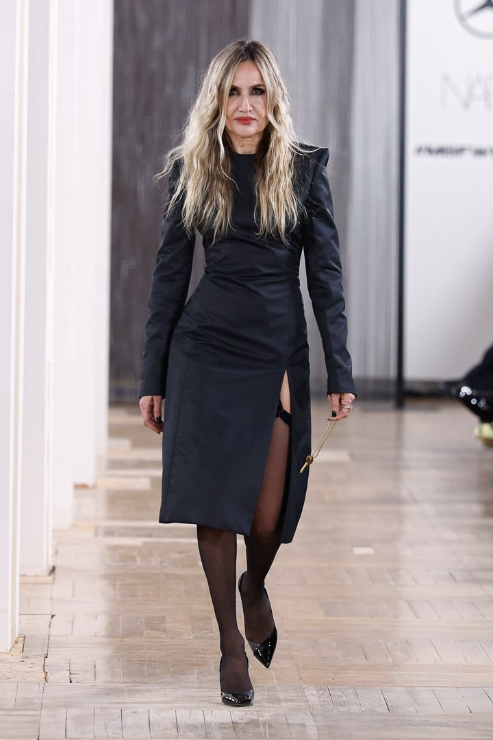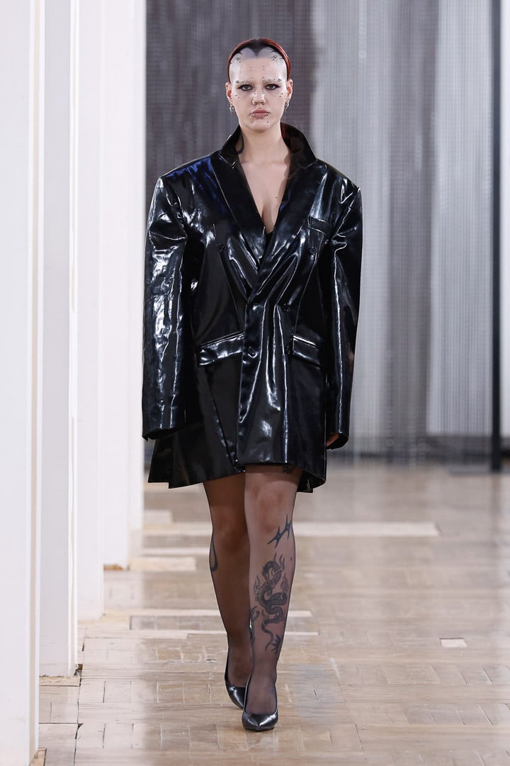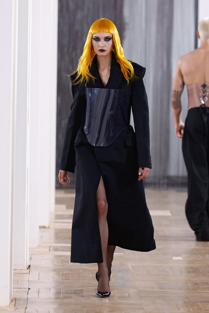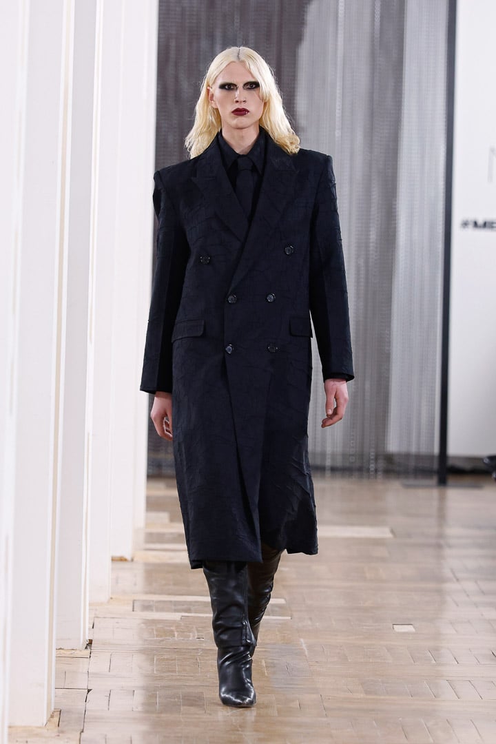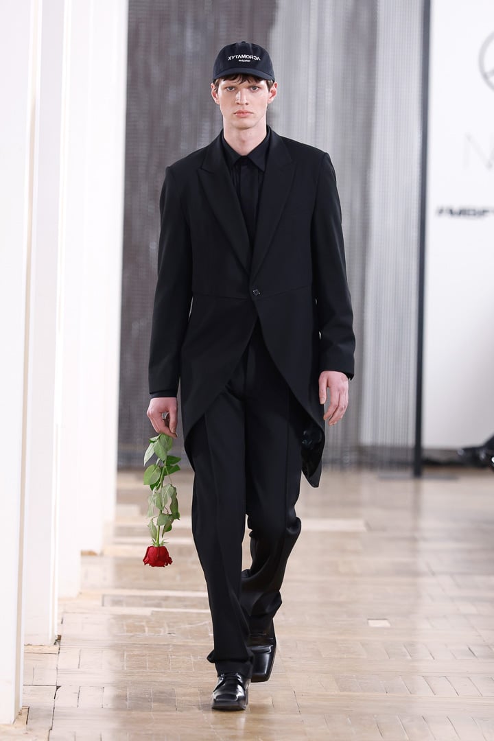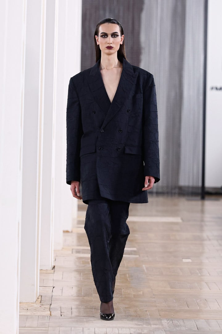 Acromatyx’s Fe_Male 009 collection uses black (and occasionally pure white) to explore the ephemeral boundaries between what society dubs male and female. The designs themselves are, by and large, not particularly groundbreaking, but for a study like this, they don’t really need to be. Boxy, 1980s-inspired double-breasted blazers are put unapologetically on female-presenting bodies without tailoring, androgenizing the wearer.