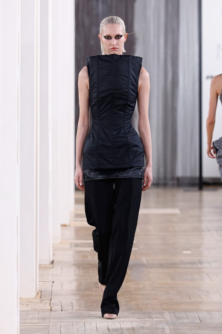 Perhaps the most avant-garde pieces of the show were black jumpsuits that played with geometry and structure. The bottom half, a simple enough cigarette trouser, was paired with a top that completely distorted the shape of the torso into a rectangle that grazed the bottom of the chin. Secondary sex characteristics were nearly completely obliterated, but the real question posed by this piece seemed to be whether it was protecting or imprisoning the wearer.