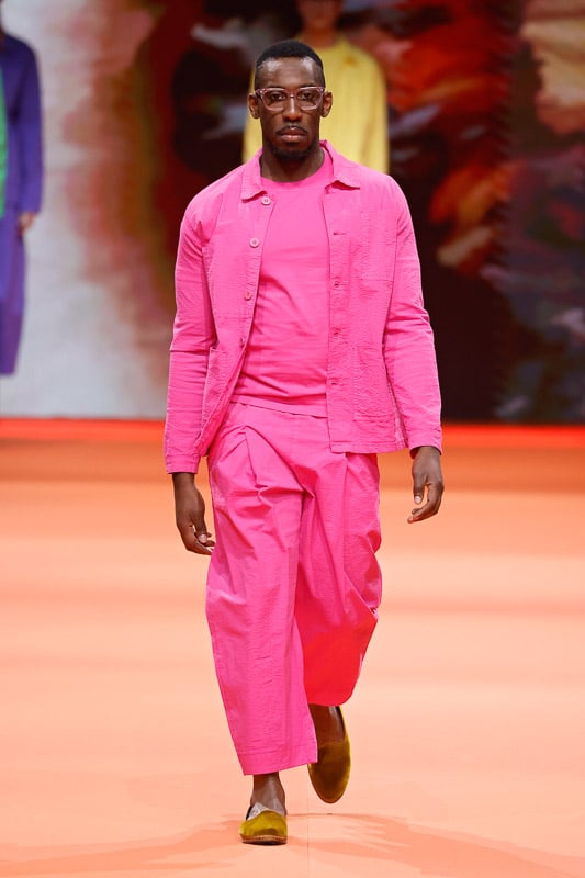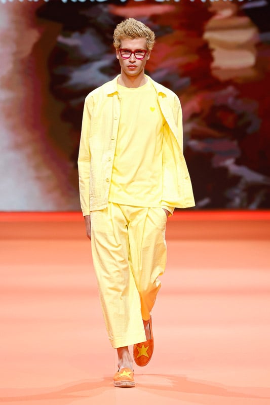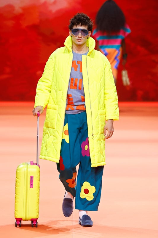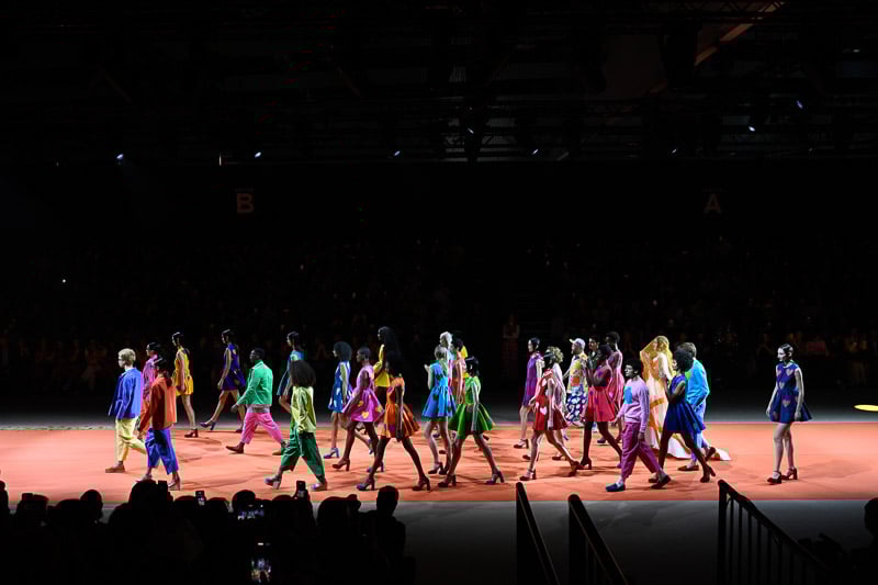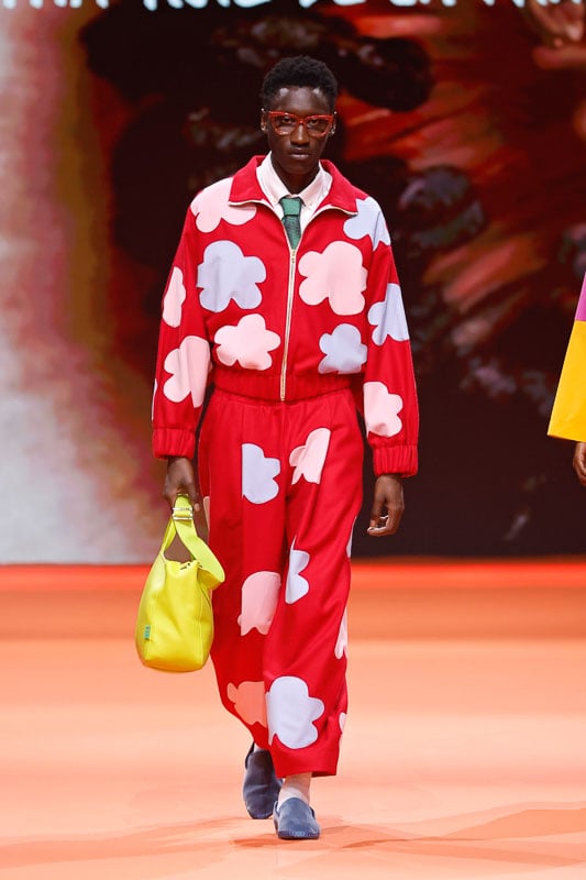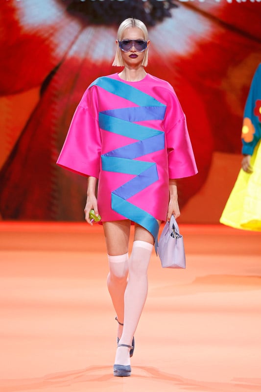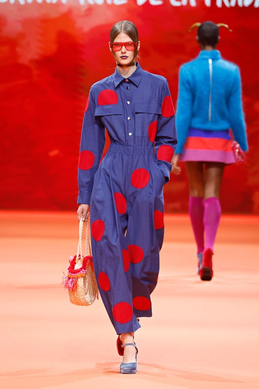 Color stands out as one of the most striking elements of the new collection. Bright, vivid, and neon tones energize the runway and give the collection a strong visual identity. For example, the blue dress with red polka dots is particularly memorable, while mismatched shoes add a playful touch.