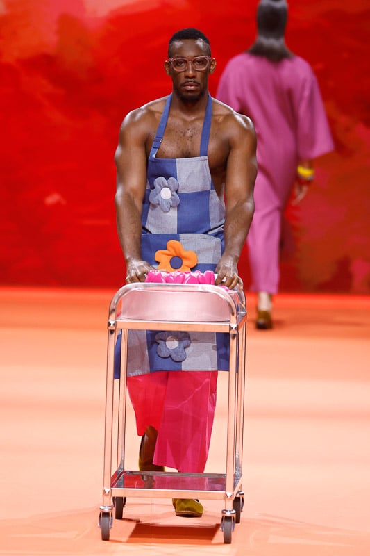 The show also includes moments of humor and surprise. At one point, a model walks down the runway carrying a tray with a cake, adding a lighthearted detail.