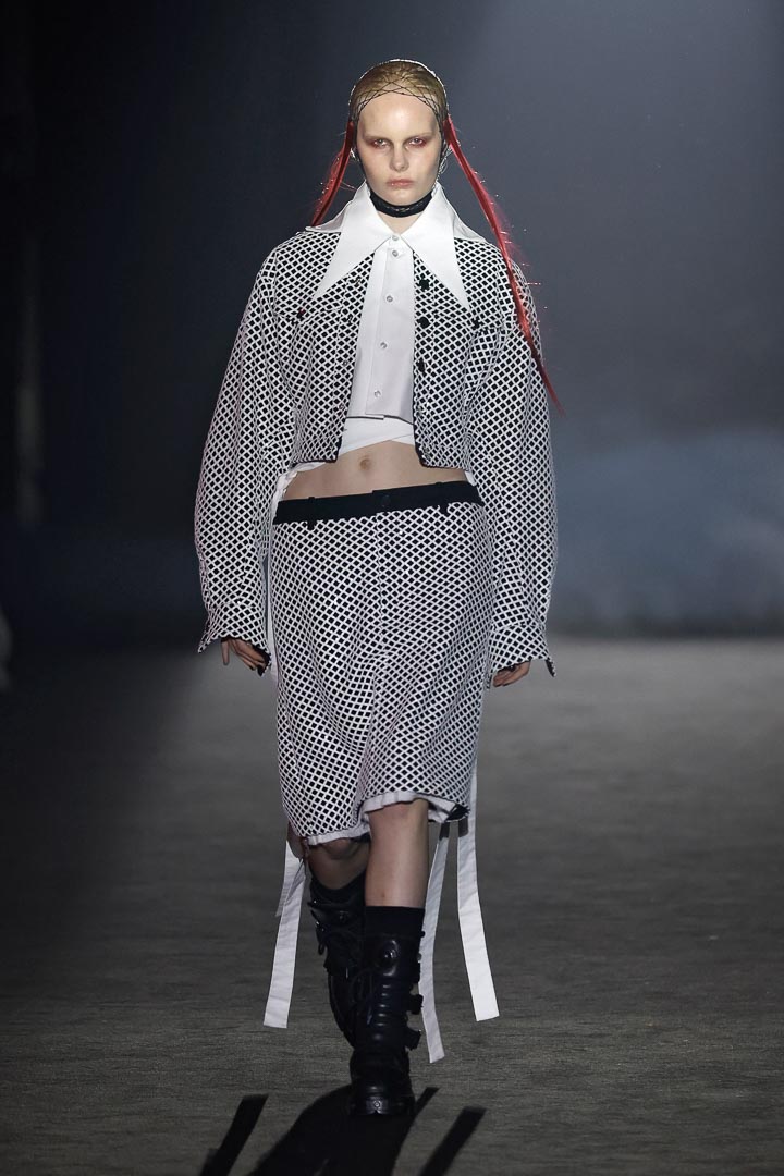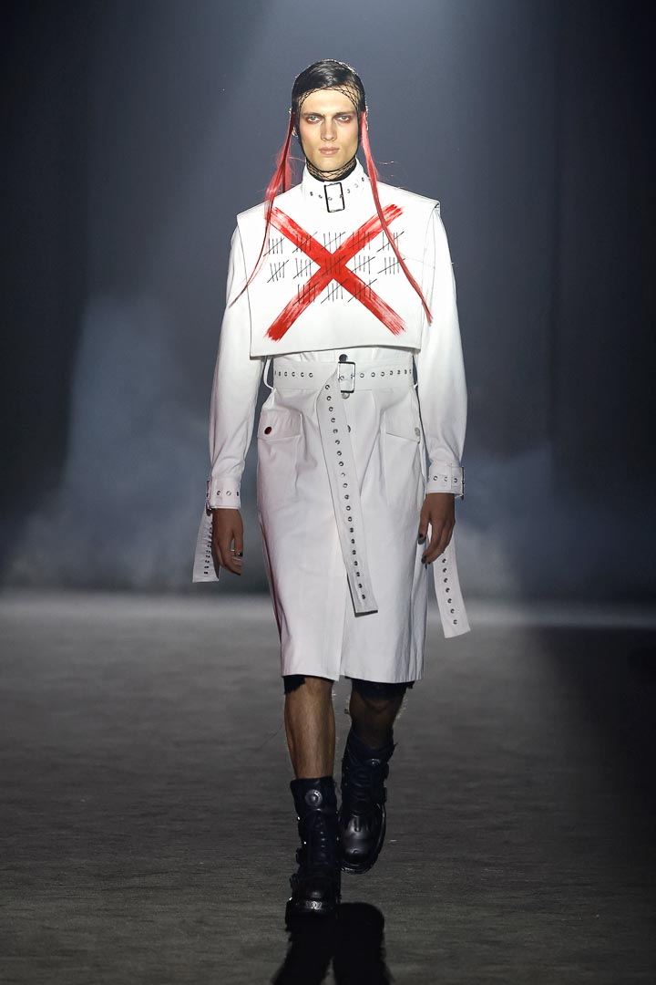 One outstanding outfit was a white coat dress featuring a tailored bib that was layered in the front. The skirt was belted and fitted with silver buttons up the front. Although there was a jarring red “X” on the front of the bib with tally marks in light gray, the coat dress was beautifully tailored and provided fabulous symbology.
