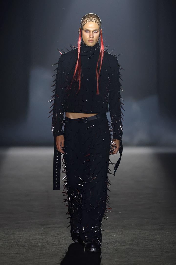 Another fascinating look was an all-black, high-necked shirt and pants. The material was embedded with dozens of quills. Again, the outfit was tailored and elegant at its core. The quills provided a fascinating embellishment along with belts attached to the ends of the arm sleeves.
