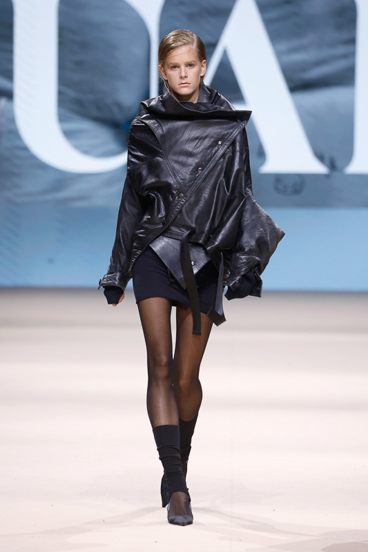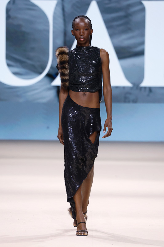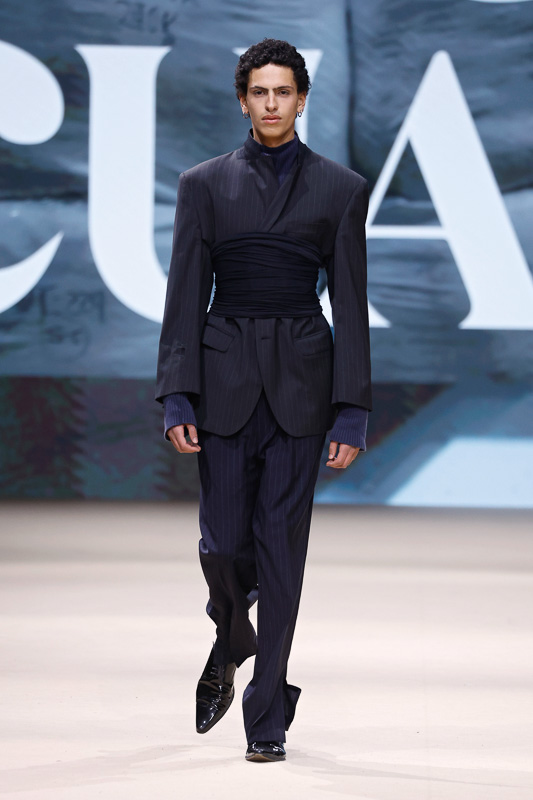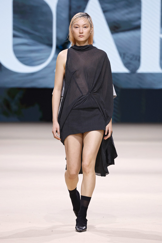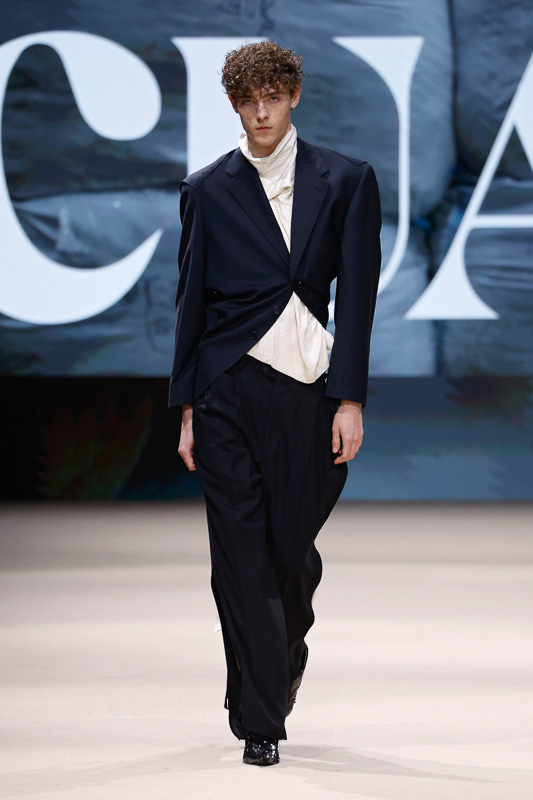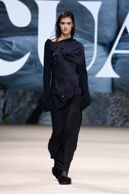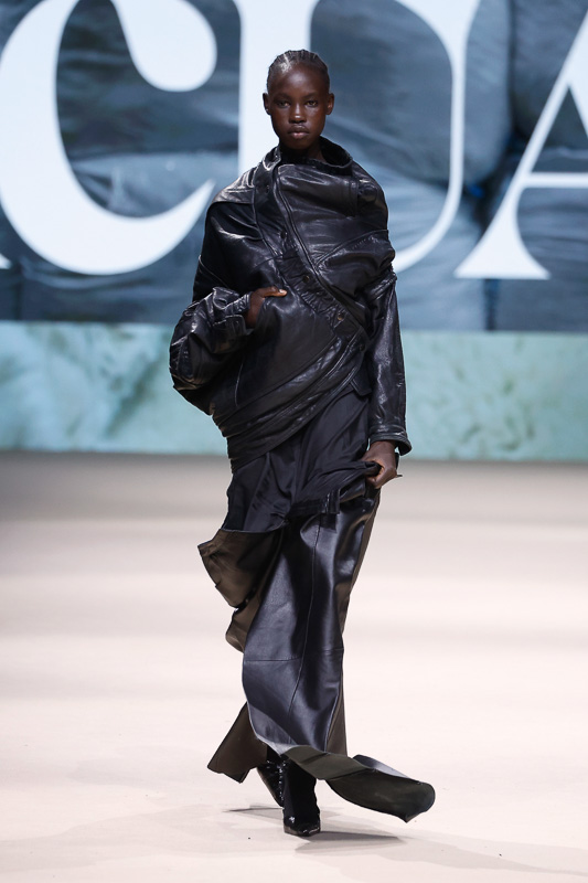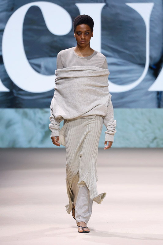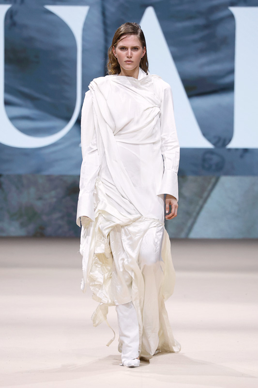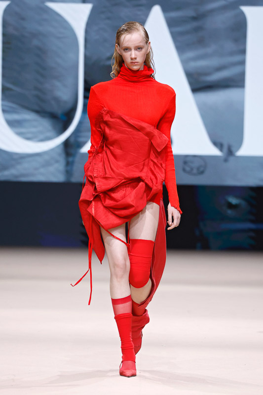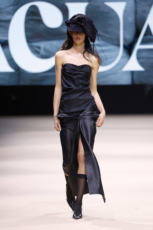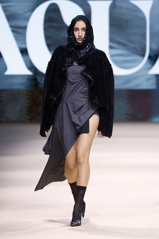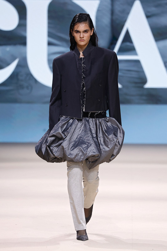 With a notable focus on unmistakably polished colors like navy, blacks, greys, whites, and quick pops of scarlet, complemented by unexpected drapes, twists, knots, cutouts, and expression, the collection feels almost perfect in correlation to Acuario’s message. However, there is an occasional ambiguity in the edit. The exposed details and the layered textures, although central to the narrative, sometimes lack the hierarchy or visual order that one expects. Without the element of restraint, the eye struggles to focus, making certain looks feel more dense than deliberate.
