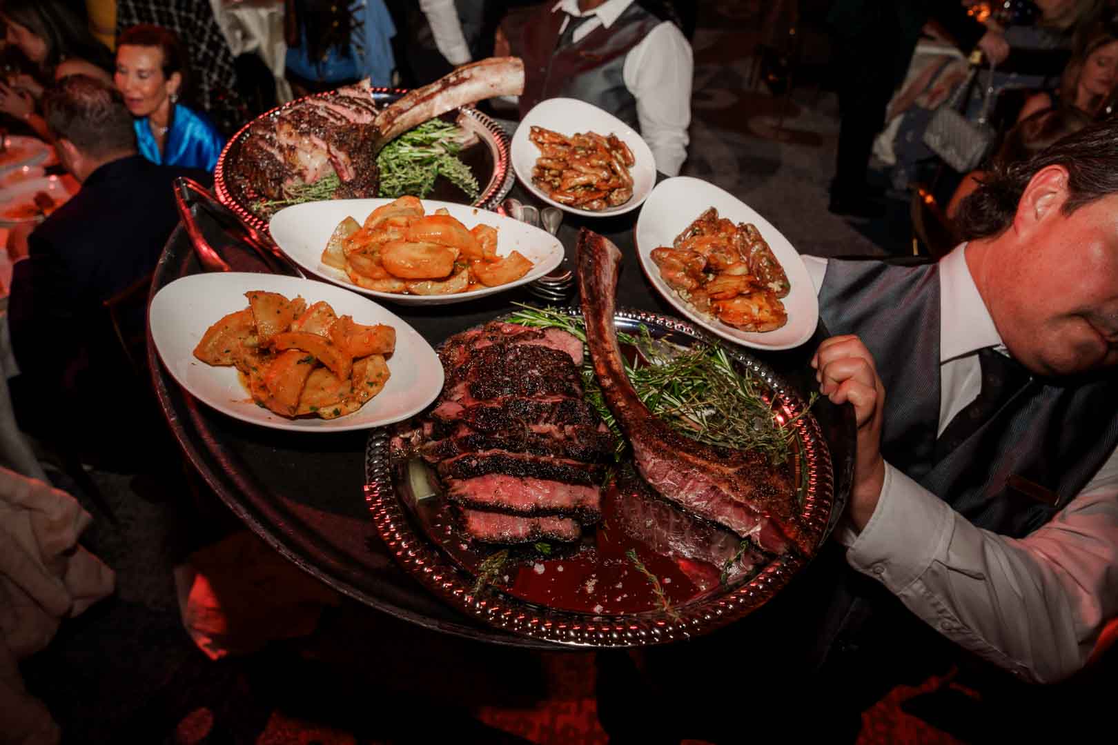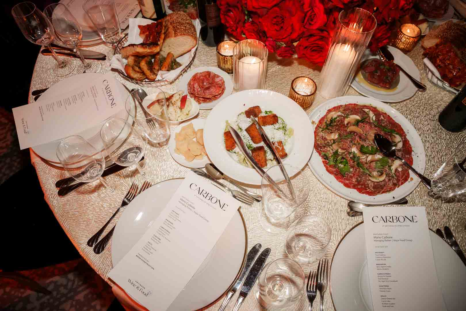Walking under the red rose arbor, I entered the Grand Ballroom and was instantly bathed in red velvet and crystal chandeliers. Towering candelabras, gold mercury glass votives and candles of various heights, and magnificent, bursting red rose arrangements dazzled in splendor in the center of the gold and black tables. I sat down in my art deco backed gold and black velvet chair and placed my gold velvet napkin on my lap, while the live band played on. The tables were set for our family style Italian-American masterpiece of five courses that took us on the journey of the Carbone vision, perspective and experience.
