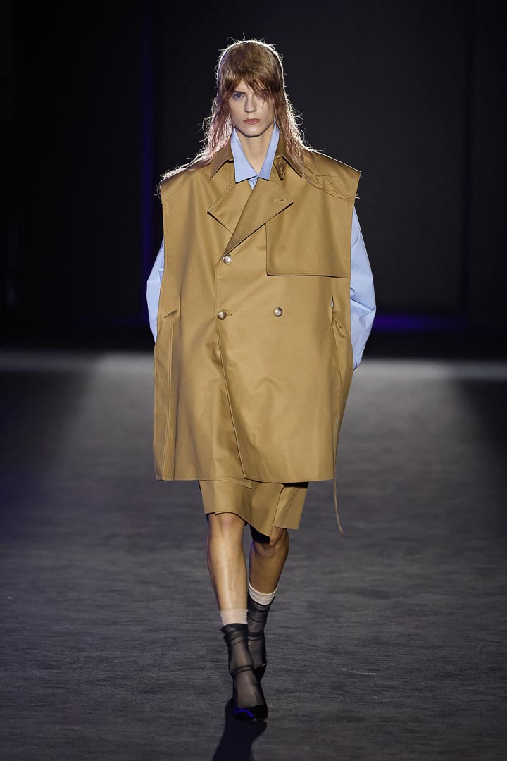 Another lovely design was a complex and architectural blazer crafted from elegant khaki fabric and carefully tailored to be refined. But it came in two attached pieces, the typical double-breasted body overlaid with what can only be described as a shrug that layered over the shoulders and long sleeves. It was both astonishing and beautiful. Although this piece was presented on its own, we can imagine it combined with skirts or trousers and worn by any gender in a terribly fashionable bar or restaurant.