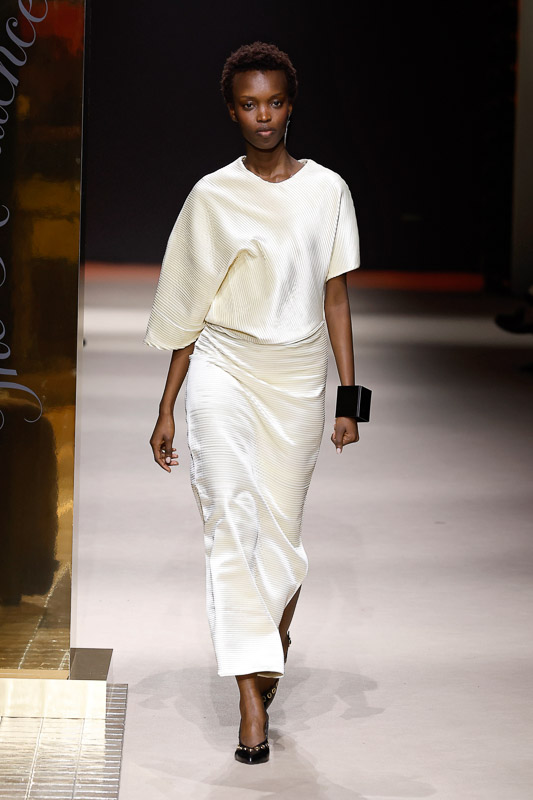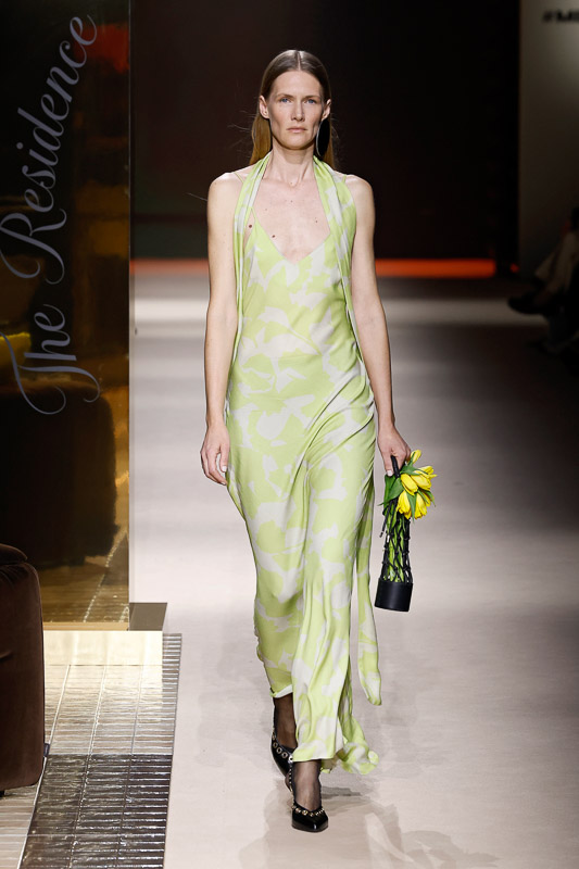 Thirty mixed looks came down the runway, and sustainability remained at the heart of all of them. The colors of the collection started with natural, warm tones. Blacks and off-whites led the way, and then greens and soft pinks followed, giving everything a fresh, lively feel.