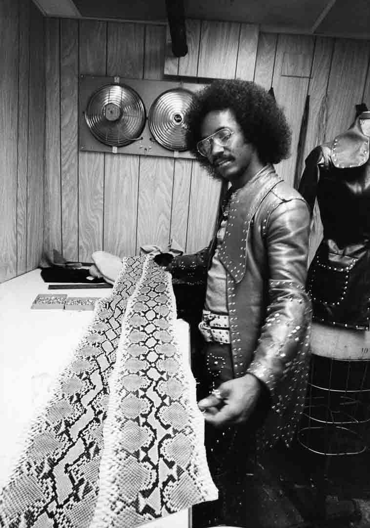 Calvin started as a hair and makeup artist in New York, where he became friends with designers like Halston. Denise explains, “He began making leather and denim pieces for himself. Musicians at Steve Paul’s The Scene, including Jimi Hendrix, Jim Morrison, The Rolling Stones, Bootsy Collins, and George Clinton, started coming to him for edgy, handcrafted garments.” In the 1970s, Calvin also had a store on Madison Avenue called “Love Creations by Calvin.”