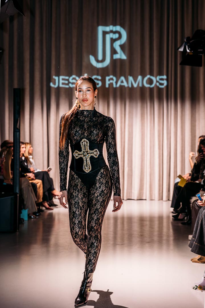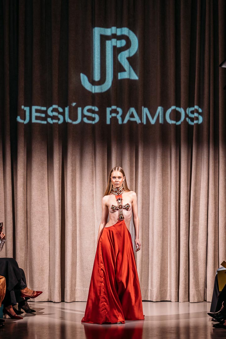 The Venezuelan designer Jesús Ramos opened this second block with his Misericordia collection, a fusion of spirituality and art, taking religious symbolism and the ornamental richness of the Baroque as his starting point. Bejeweled crosses adorned the models’ bare torsos, and intricately decorated corsets sculpted muscular bodies. A daring, challenging, and visually captivating proposal that closed with one of my favorite moments: seeing the designer genuinely moved during his final bow.