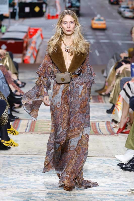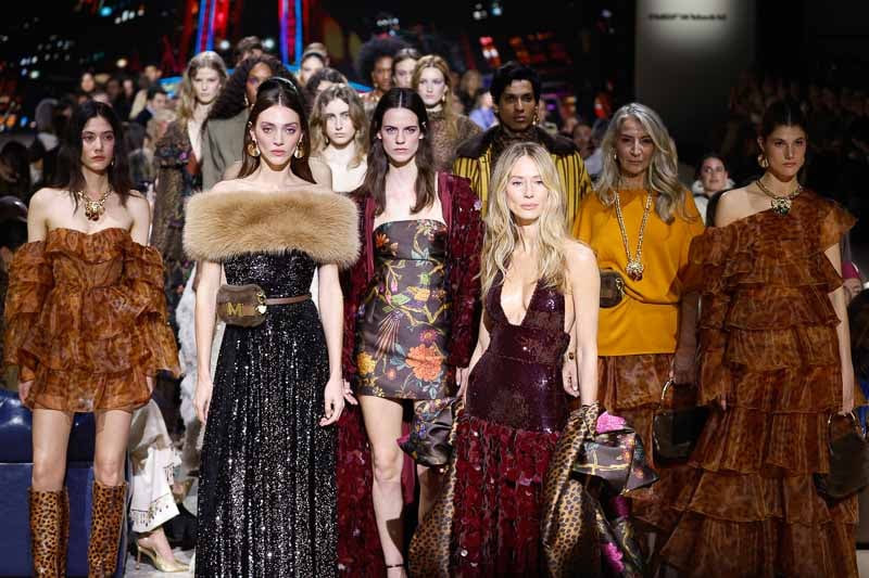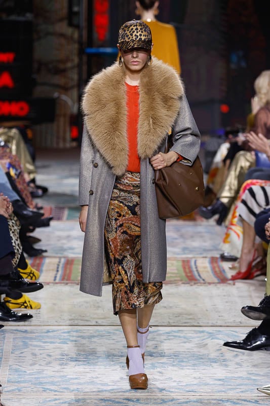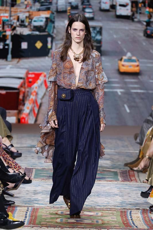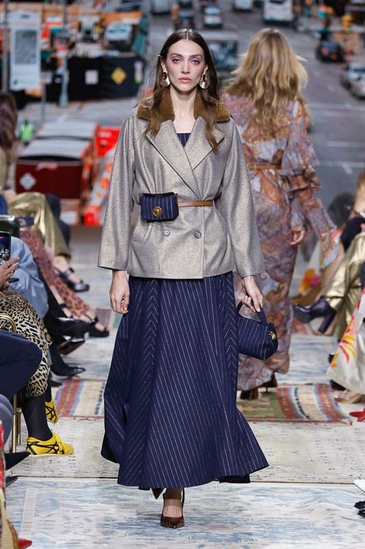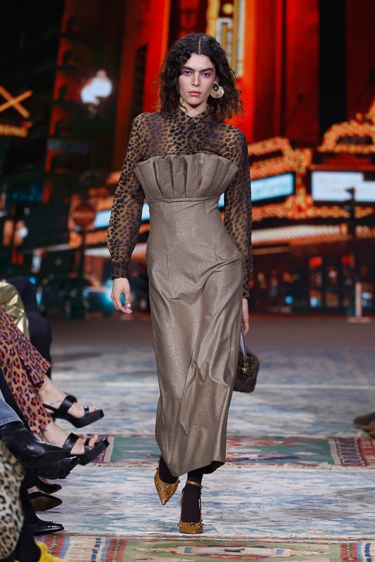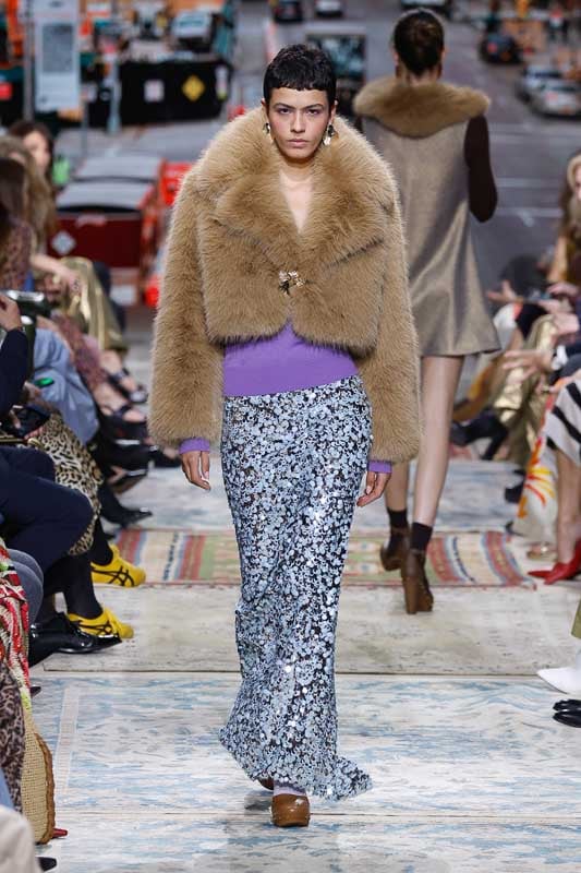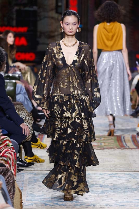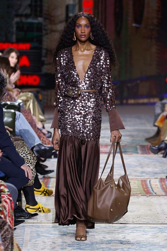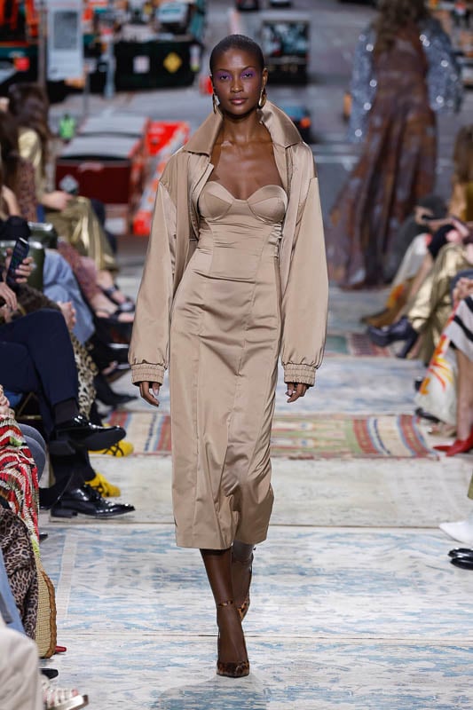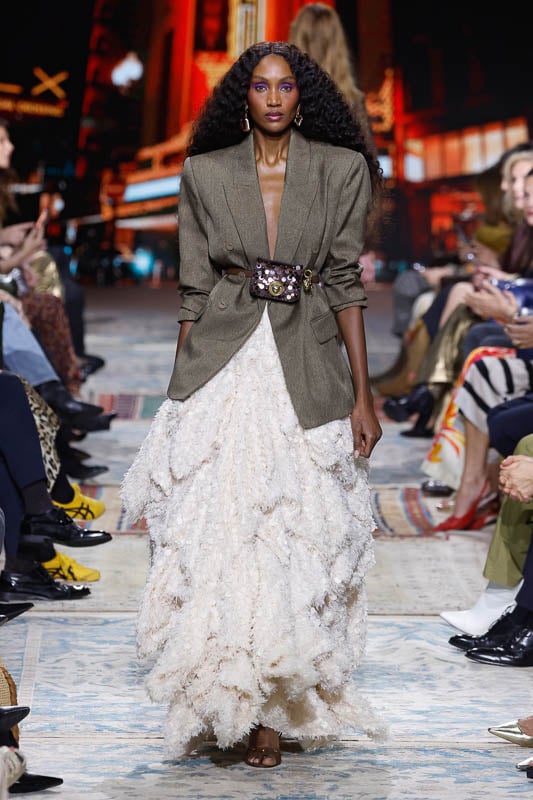 The balance was so strikingly established during some moments that it was hard not to look past. Tailored elements like vinyl jackets and blazers, firmly grounded fluid fabrics, and maxi dresses. At the same time, bold prints borrowed from an artistic episode of New York, such as florals, paisleys, vintage geometrics, retro logomania, and the iconic animal print, were offset by cleaner lines and refined silhouettes. These intentional contrasts paved the way for a unique tension that felt modern, and not costume-like.
