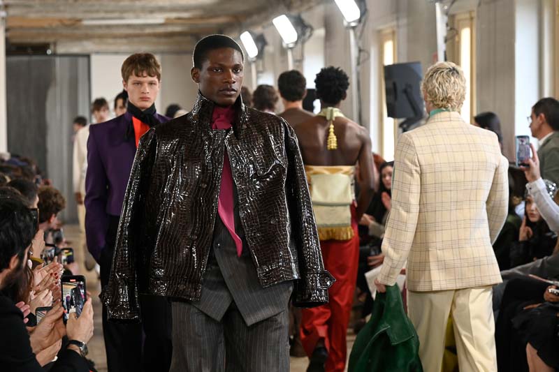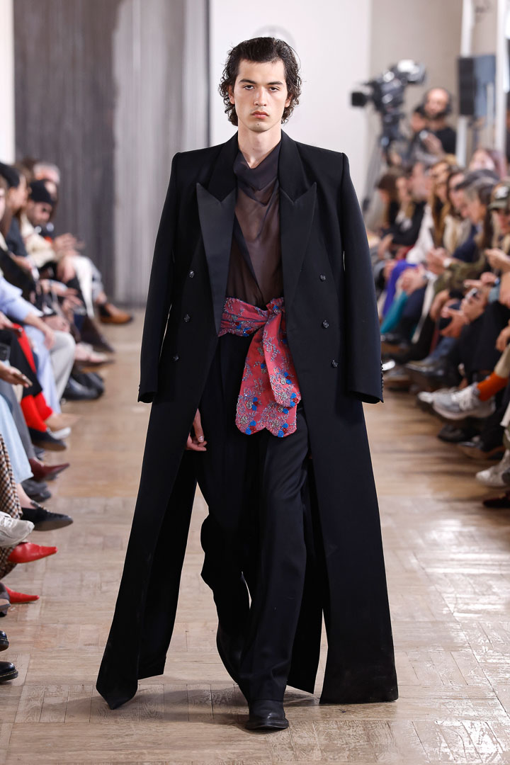 One would think leather would be heavy, but Jaime, through color and his own genius, gave these trousers an airy, flowing style. The shirt and tie were beautiful reminders of the traditional, but the Obi transcended the outfit into the sublime. The sequined Obi used mint green as its foundation color, but then was embellished with delightful tiny flowers in cream, lilac, and a darker moss. This was the epitome of Mans new take on menswear.