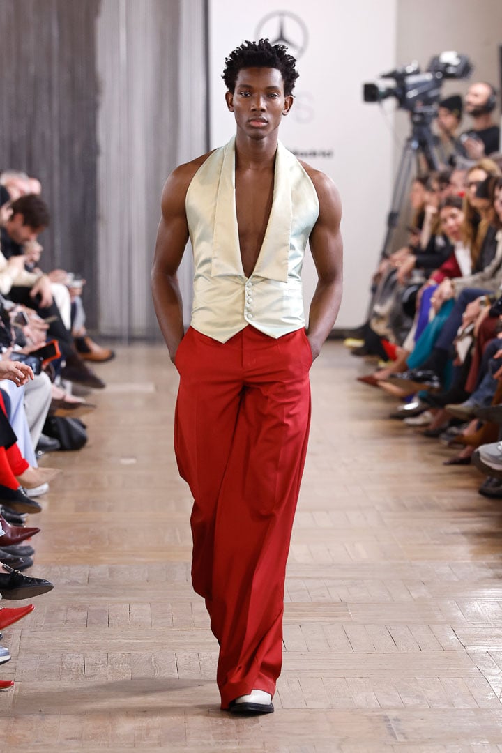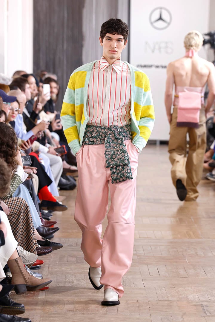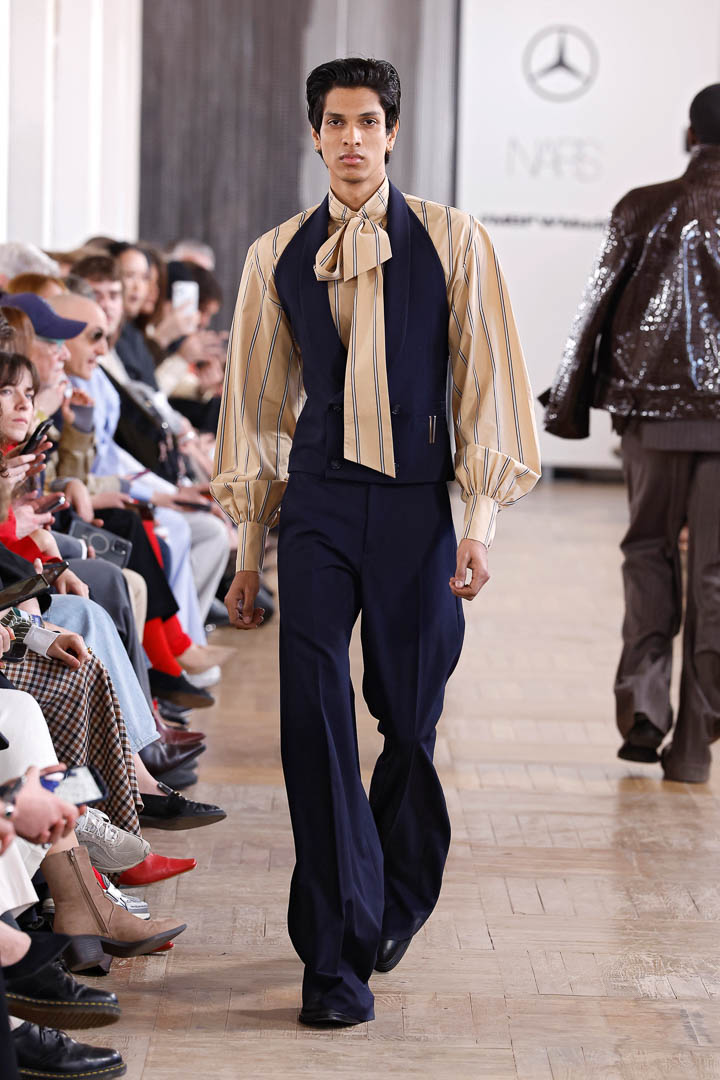 A final look that needs to be discussed is a saturated sun-yellow leather jacket with small horizontal beige stripes, giving it depth and style. It was matched with a preppy striped sweater vest in the same sun-yellow and a deeper caramel color. The shirt was a pale dusty blue and had a high collar that transitioned into a loose tie. This design maintains a masculine motif while still showing a more delicate sensibility.