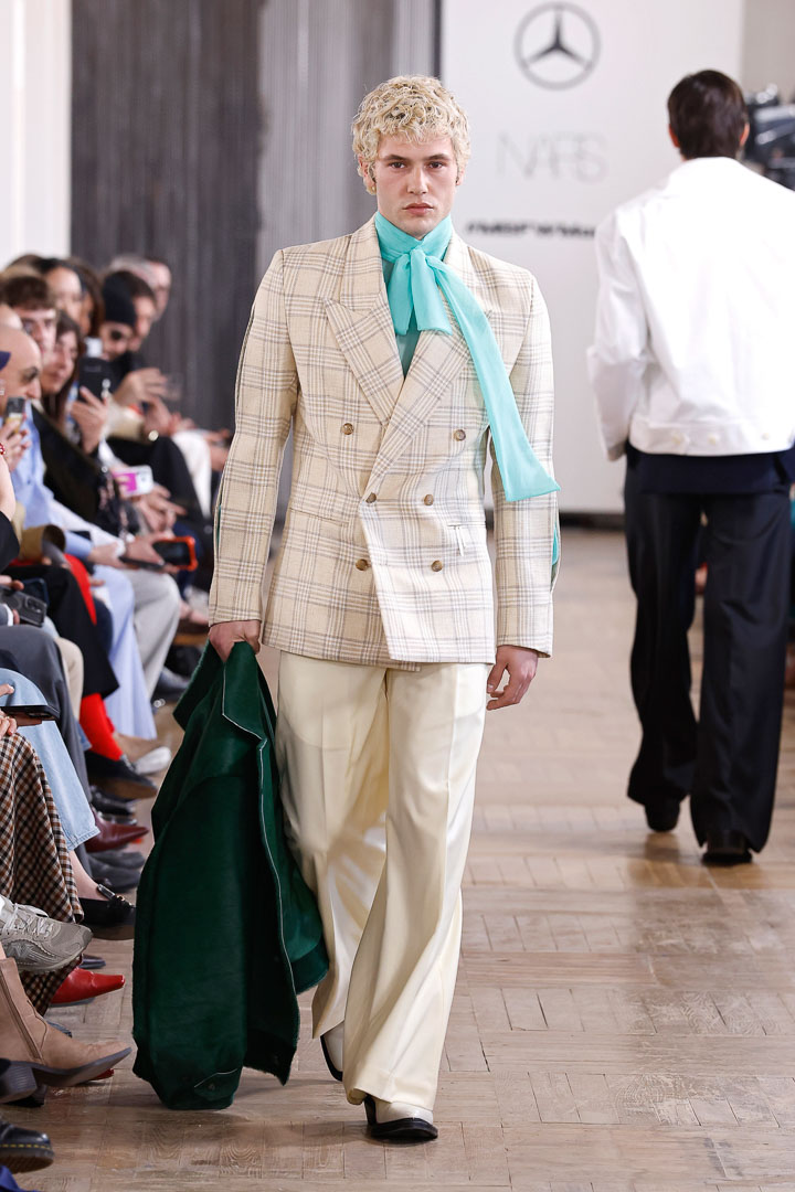 A specific example of all this hyperbole is a magnificent combination of blazer, shirt, trousers, and tie that frankly made me swoon. I adore the juxtaposition of euro-preppy with Mans’ emphasis on romance, and how Jaime pushes the boundaries of what is fashionable without neutering a male point of view. The blazer is a traditional camel wool with slick lines and a single button, which is apropos, because you would not want to hide the mint-green pleated trousers in leather.