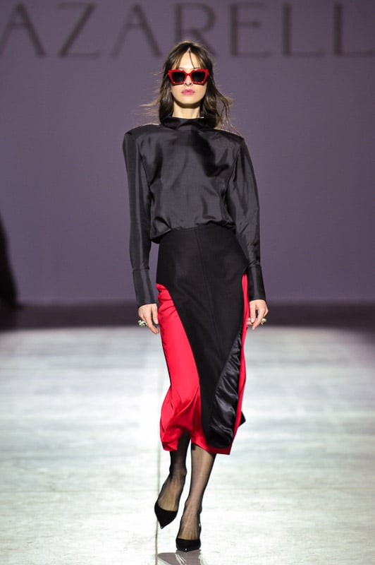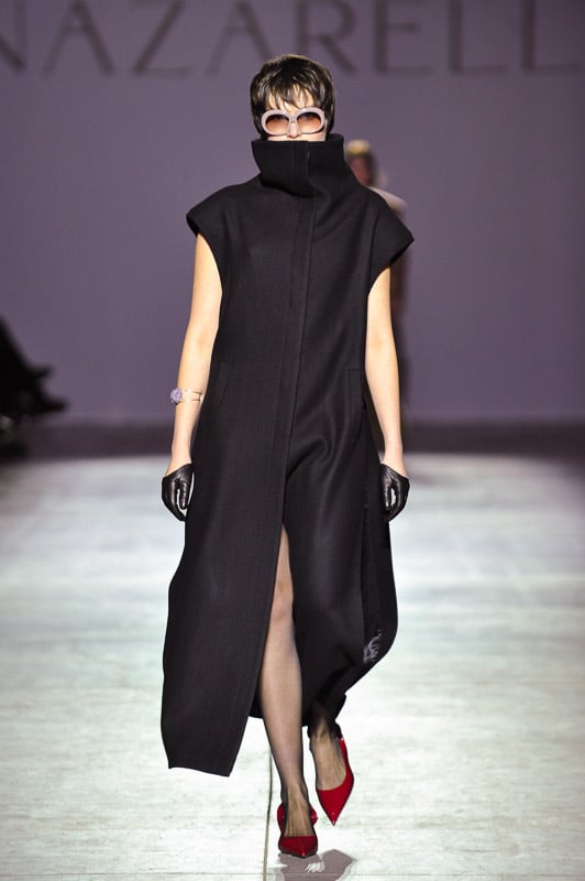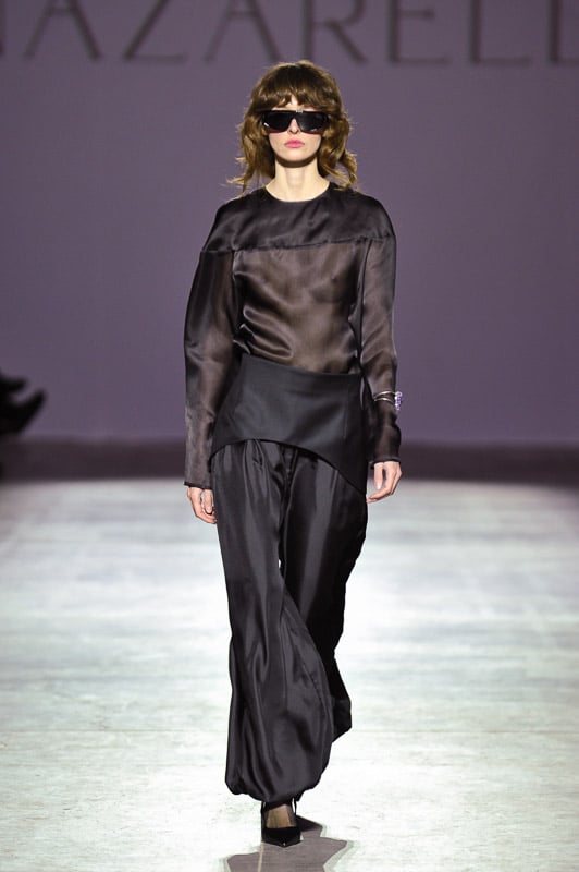 Another look is an all-black tunic paired with a long maxi skirt that looks effortless but is clearly very carefully constructed. The top is a long-sleeved, belted tunic that flares from the cinched waist in an upside-down “V” that falls over the hips. It is a unique and flattering piece which combines Nazarelli’s elegance and architecture. The skirt is long and billows out with a long slit up the side. Together, this outfit is unique and embodies the designer’s vision of femininity and strength.