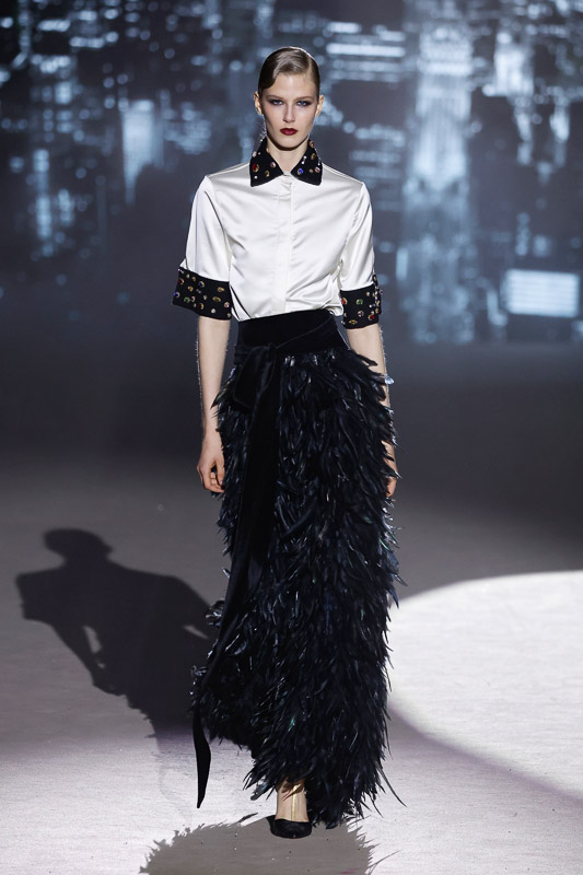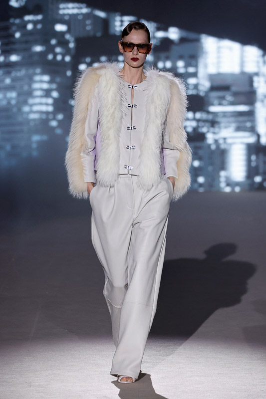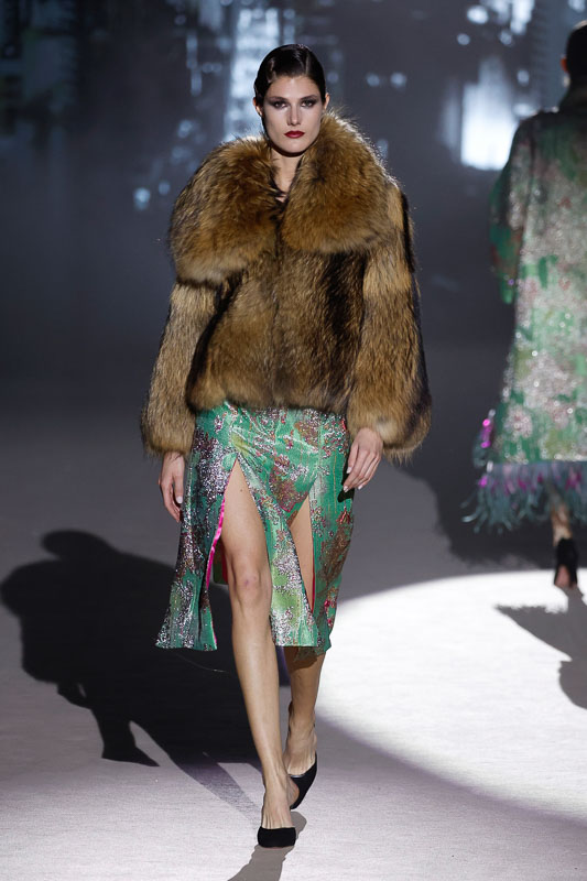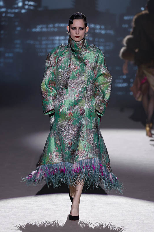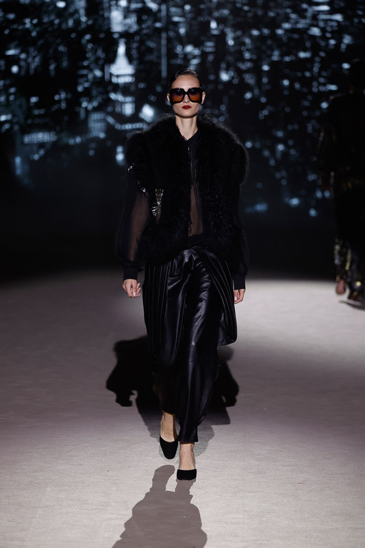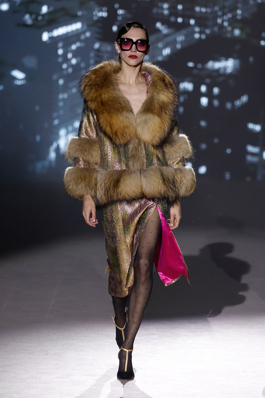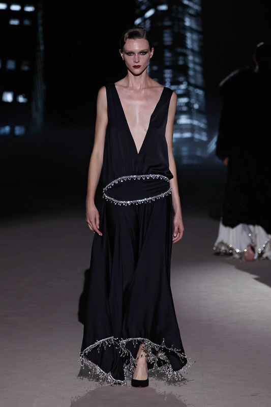 Many pieces are combined with statement fur coats redolent of the “cocoon coats” of the period. The furs are paired with wonderfully fun lining (hot pink satin!) and worn unapologetically over sheer lingerie-inspired pieces. The heaviness of the fur is lightened completely by pairing it this way, letting both pieces speak for themselves. It would be an almost cliched look if not styled with such effortless cool.