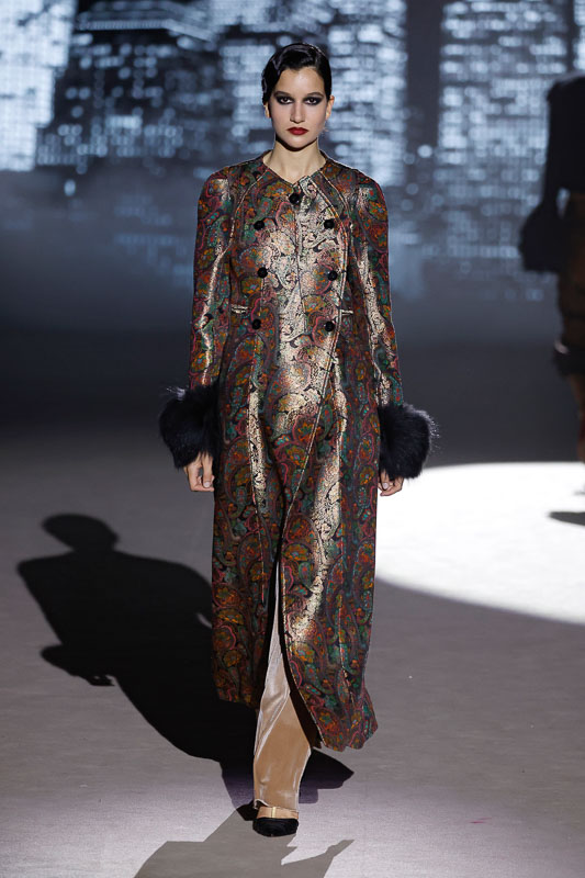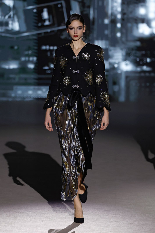 Delightfully, the ’20s solid thumbing of the nose at gender lines is also brought up to the current. A white satin suit comprised of pleated-waist pants, a short vest, and a sweeping duster jacket is almost impossibly chic. Gold beading dots the jacket like little bursts of fireworks. It’s “masculine” in its tailoring, but not in the fit or wearing, as if the ensemble couldn’t be bothered to limit itself.