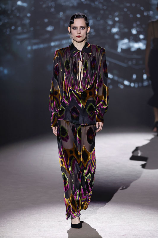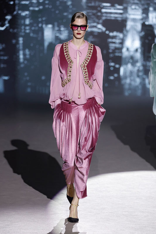 There’s even a nod to one of the overlooked scandalous garments of the period: pajamas. The idea that women would sleep in pants was somehow as damning as wearing them during the day, if not more so. A cheery pink ensemble brings them right out of the bedroom and onto the street, demanding attention and not caring if it receives it. The pink velvet pants are elegantly pleated into the waistband, creating a draping effect, while the blouse in silk chiffon is worn loosely with a pink velvet and gold vest over the top. It avoids the pitfall of looking like a costume with its casual wear. Velvets, satins, and furs are all worn next to each other, catching the light and letting the simple, understated elegance of the pieces speak for themselves.