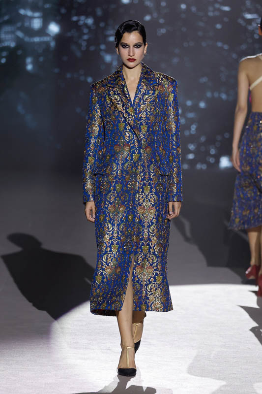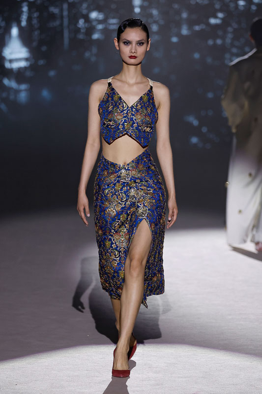 There’s a focus on a number of pieces on the hem, many of which are bias cut and flared to give the most motion possible to an otherwise relatively simple silhouette. A blue and gold brocade ensemble is elevated by this design choice, with the skirt draped in a sarong-like fashion but still managing to be wonderfully tailored.