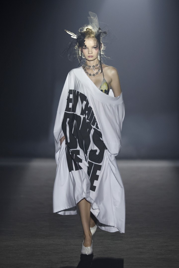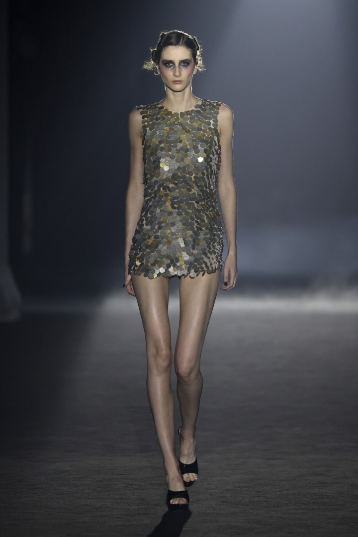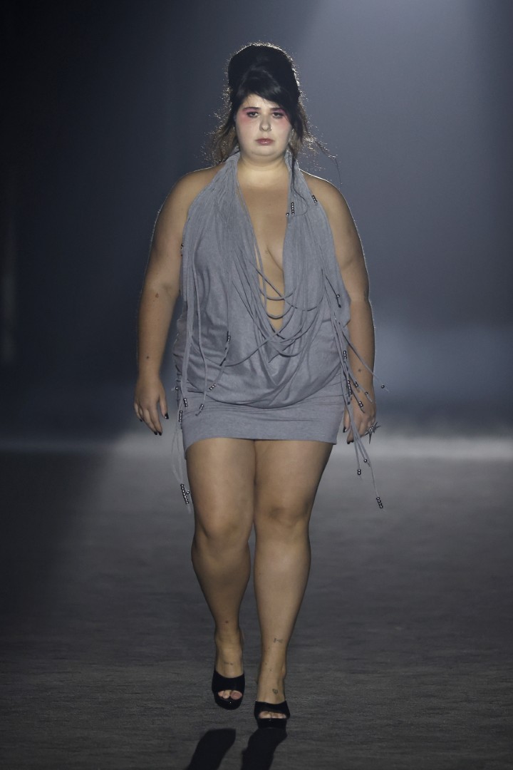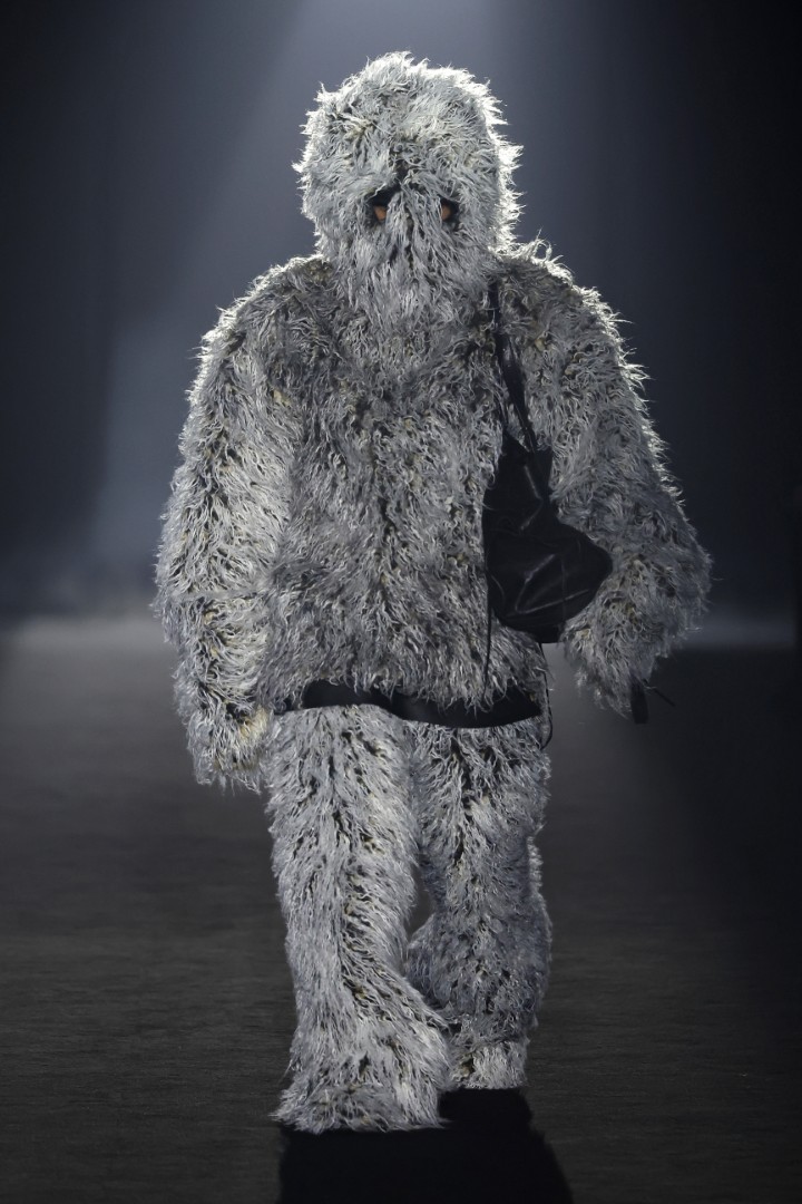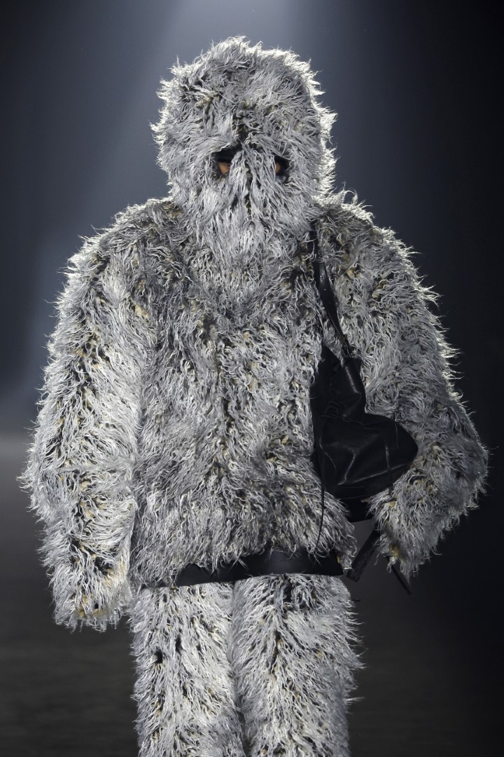 Another outfit that caught attention was a faux grey fur combination of a hoodie and pants. The model wore the design with the hood up, almost totally encapsulating their face. One might think that an outfit like this would overwhelm the wearer, but quite the opposite is true. It was fitted to the model, and although it was presented on the runway for maximum drama, one could easily envision a fashionista wearing it on the streets of New York, Barcelona, or Paris with pride and insouciance.