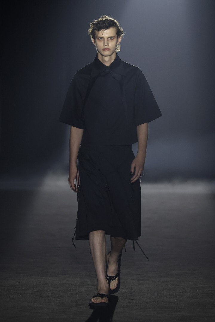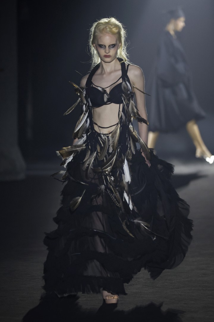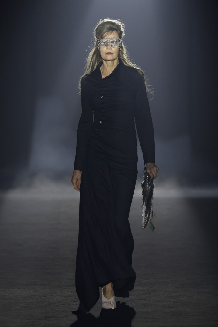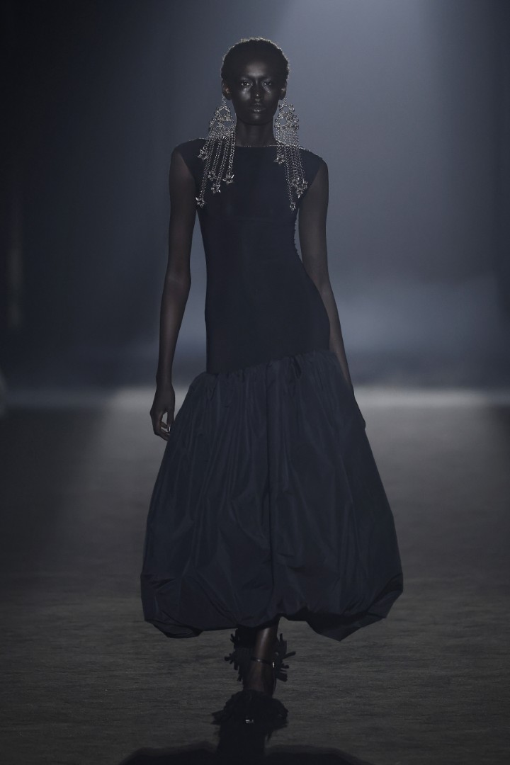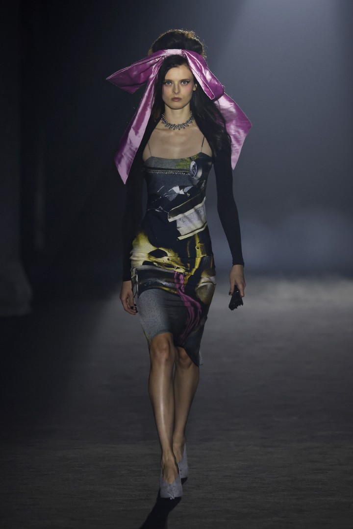 The first outfit on the runway was a fascinating slip dress that hugged the model’s body, paired with an all-black bolero shrug featuring long sleeves. The dress itself was fundamentally grey, with gorgeous imagery that featured pops of poppy pink, bone yellow, and slight touches of green. The imagery transfixes you and almost forces you to delve deeply to consider its meaning. The outfit was beautifully tailored and elegant in a very fashion-forward manner.