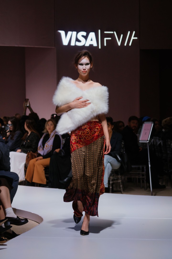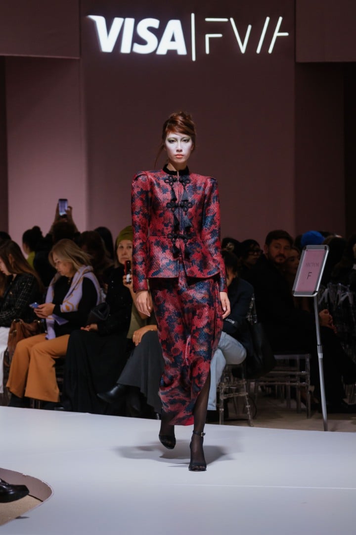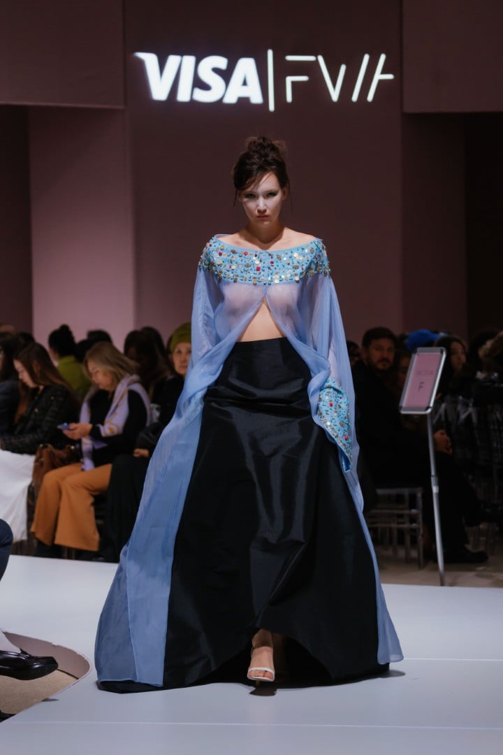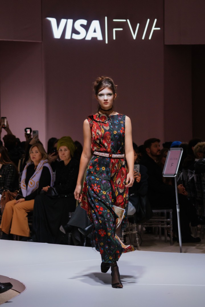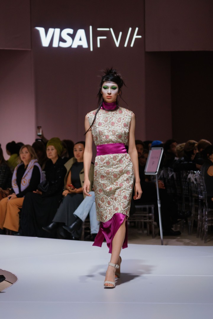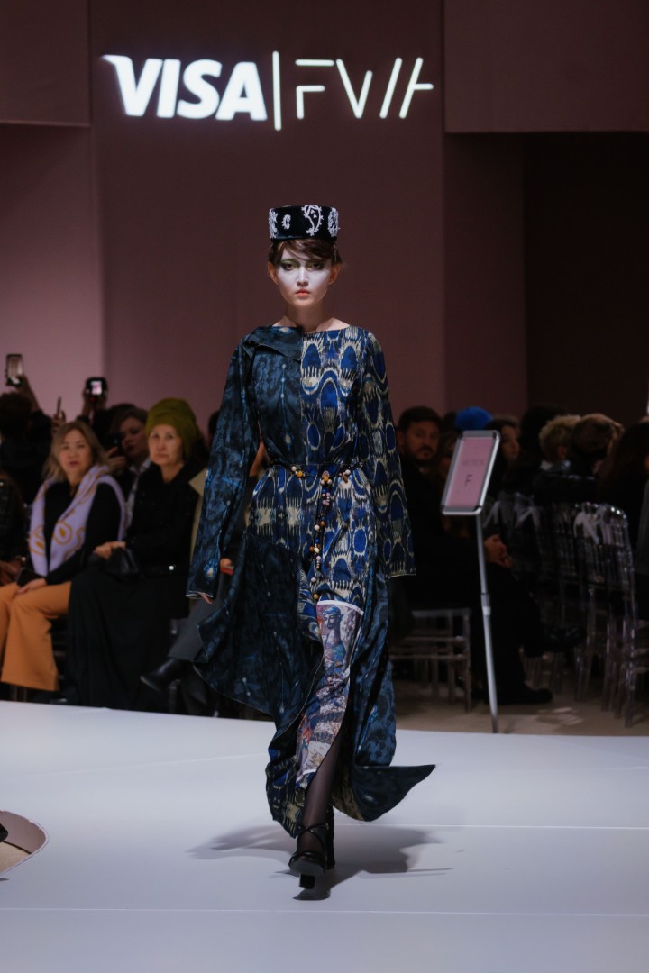 Mursak’s clothes are classic in design, featuring flowing skirts, sleeveless dresses, and gorgeous coats that reflect a more Uzbeki style. One of the first dresses presented was a sleeveless dress with a circular neckline and sweeping skirts swirling at the knee. What elevates this collection is the color composition and gorgeous traditional patterns. In this case, the dress was a combination of crimson red and royal blue. The pattern included pops of stylized yellow, green, and light blue flowers. It was elegant but terribly unique.