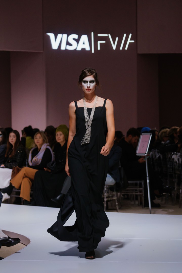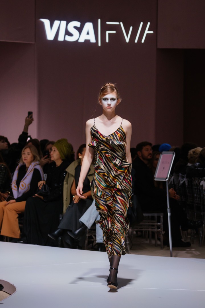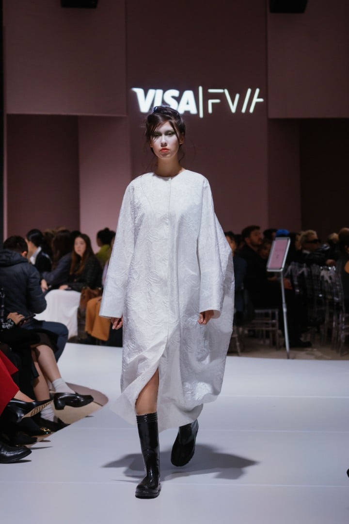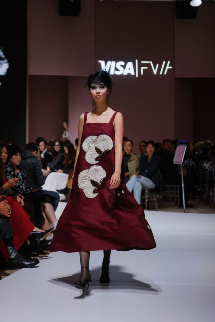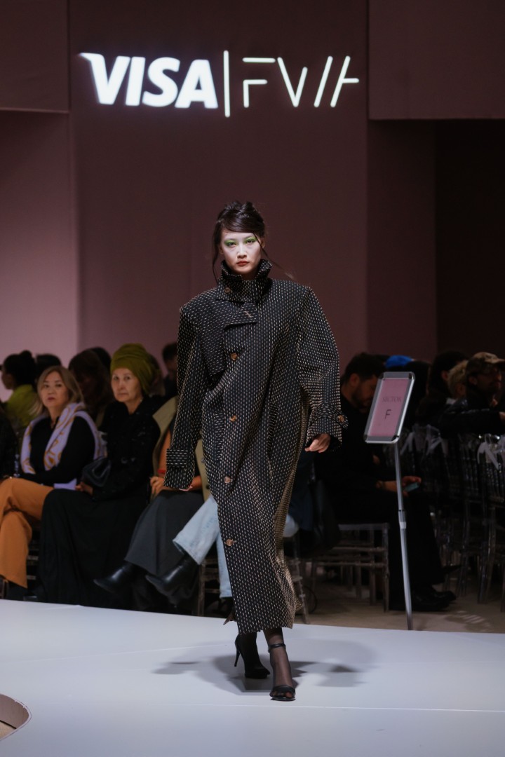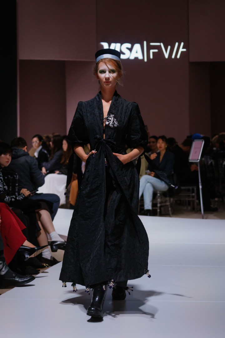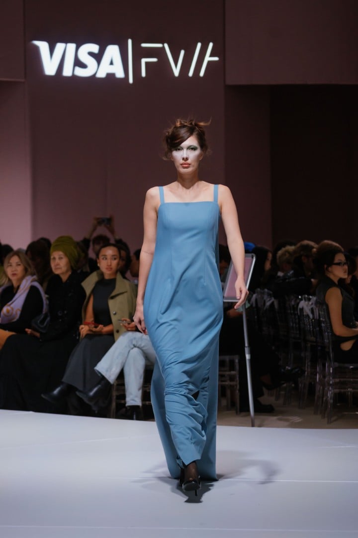 Mursak’s clothes are classic in design, featuring flowing skirts, sleeveless dresses, and gorgeous coats that reflect a more Uzbeki style. One of the first dresses presented was a sleeveless dress with a circular neckline and sweeping skirts swirling at the knee. What elevates this collection is the color composition and gorgeous traditional patterns. In this case, the dress was a combination of crimson red and royal blue. The pattern included pops of stylized yellow, green, and light blue flowers. It was elegant but terribly unique.