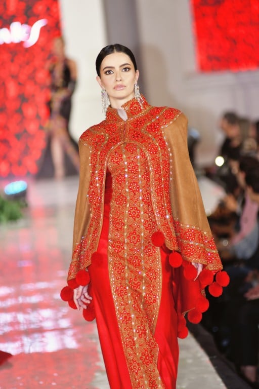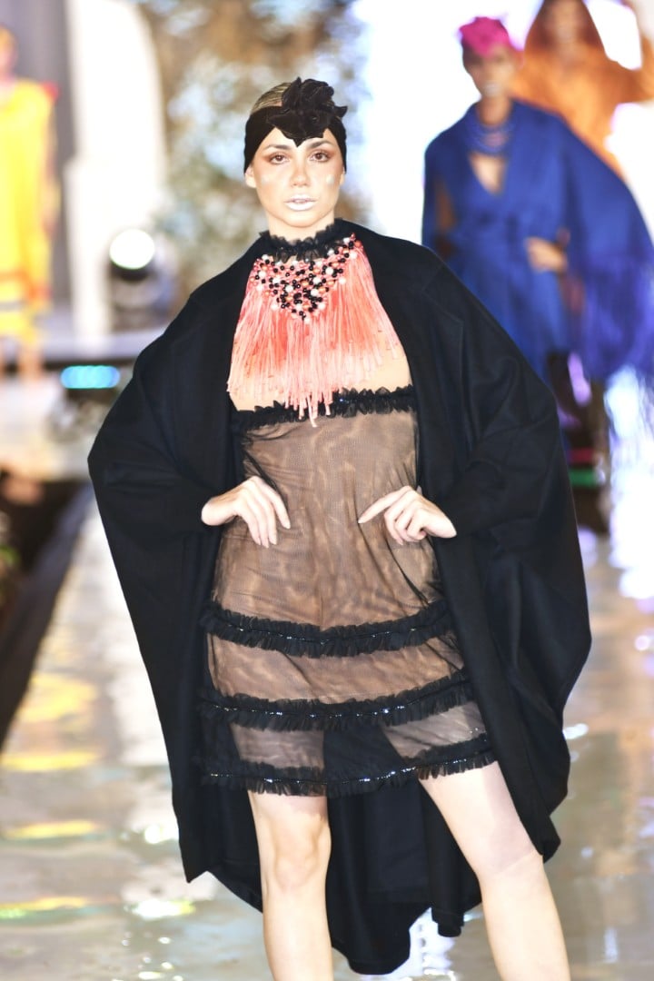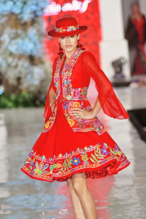 Sonia’s collection was frankly sumptuous and based on a vivid color palette of bright cherry reds and midnight blacks, all bordered in gold and traditional flowered embroidery. She was flawless with her mixture of traditional Bolivian styles and Spanish silhouettes from the 18th century. A favorite look was the first outfit down the runway. It was a beautiful symbiosis of a Spanish flamenco dress with a more breezy indigenous pollera (a layered, pleated skirt). Instead of a bombín (a small bowler hat), Sonia used a sombrero cordobés. The vibrant red of the dress was countered with flowered embroidery that leapt from the fabric. It was a truly unique look that drew inspiration from both cultures. In other outfits, Sonia played with nude fabric which mimicked the corsets used by the Spanish Duennas and long flowing skirts which modernized her collection and made it sexy as well as theatrical.