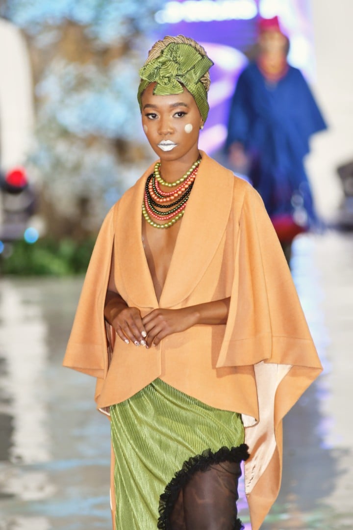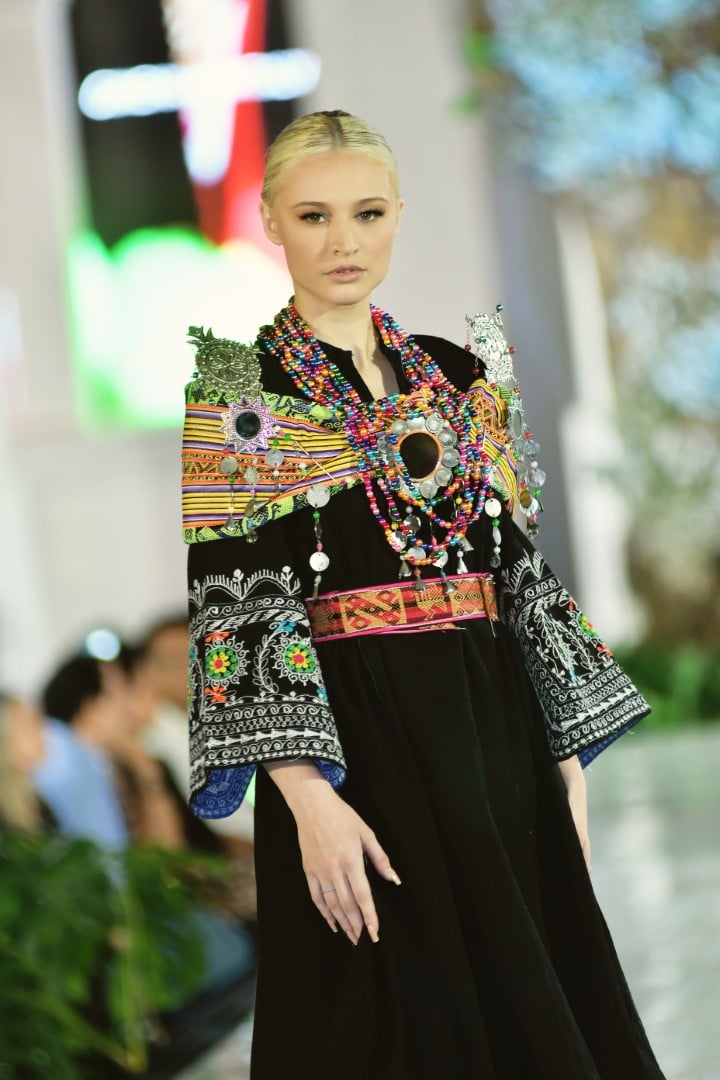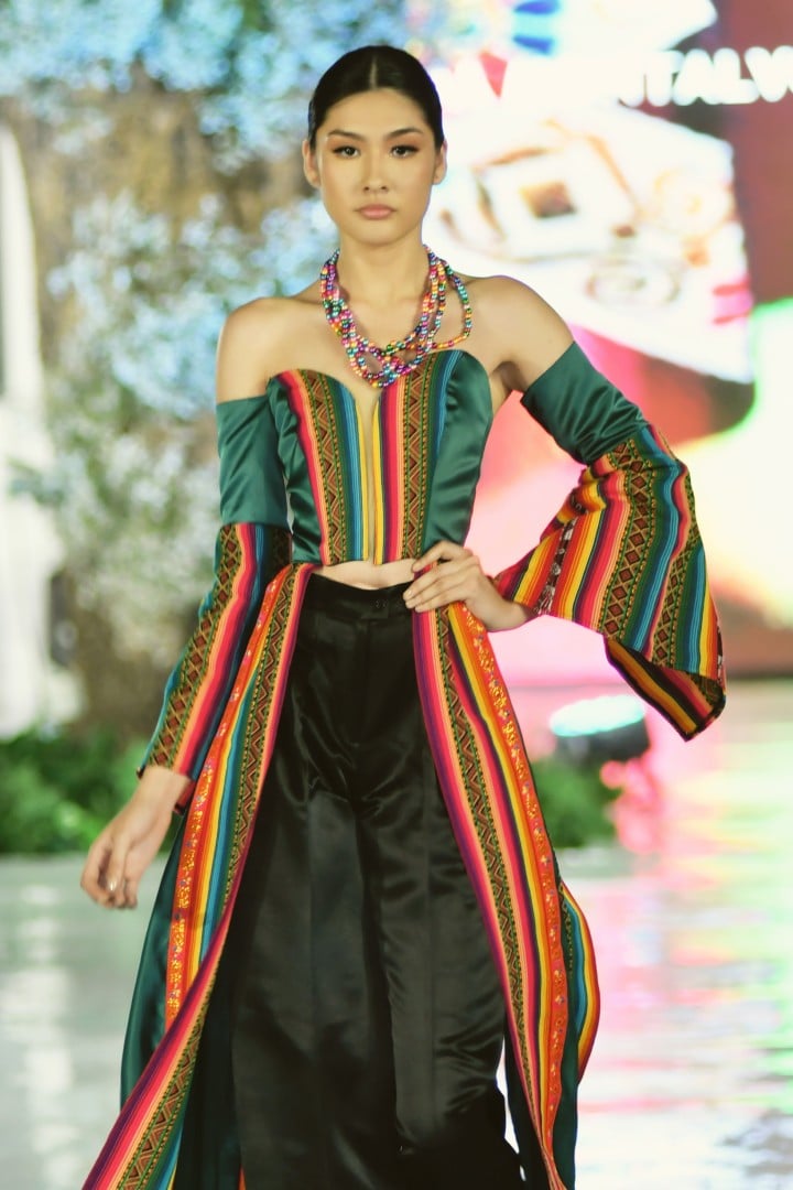 Gimena Montalvo, a Bolivian fashion designer known for her bridal wear, unveiled a more universal collection for this show. The collection was called “Munay”. The Quechua word, Munay, signifies ‘love,’ ‘will,’ and ‘willpower’, a living energy. Montalvo has inventively combined Bolivian textiles with long and mini dresses in a palette of black, red, earth tones, deep blues, and quinoa greens, accented with pops of golden yellow. The collection, a modern twist on traditional elements, features a harmonious blend of bustiers, long traditional serapes, and exquisite indigenous textiles, paying homage to Bolivia’s rich history.