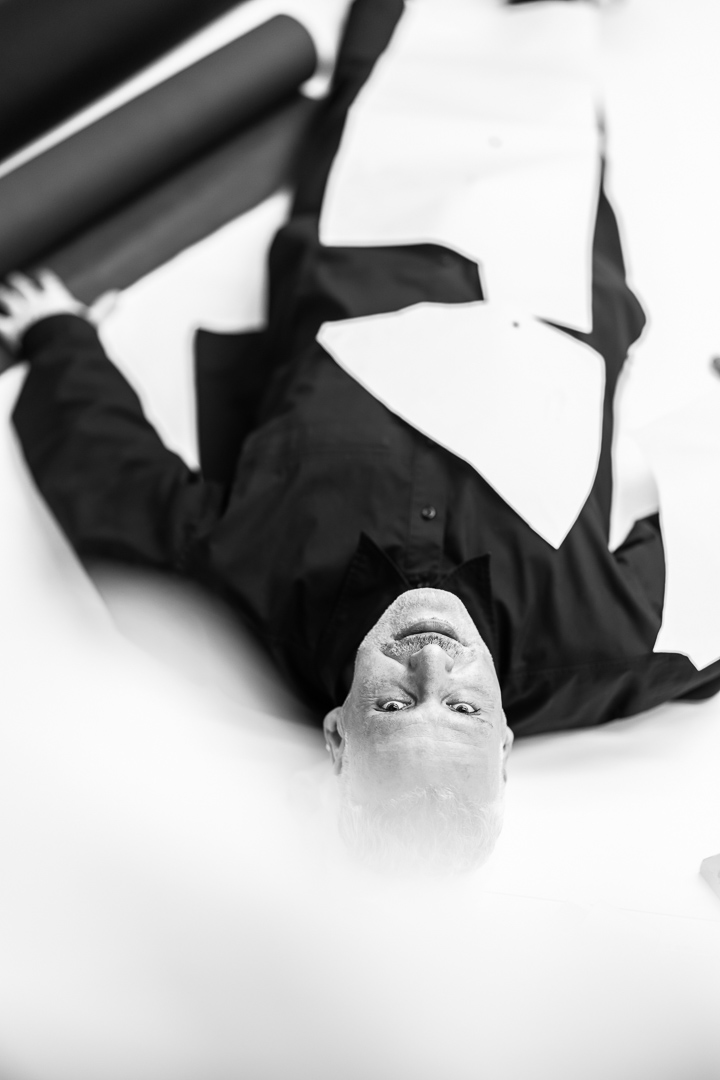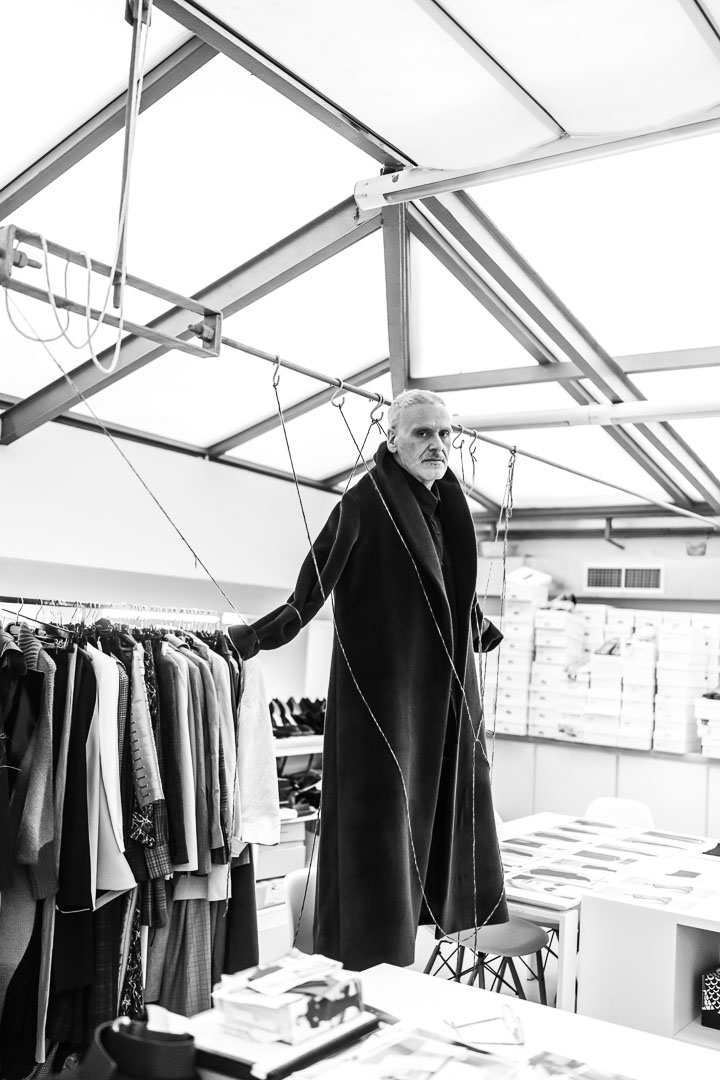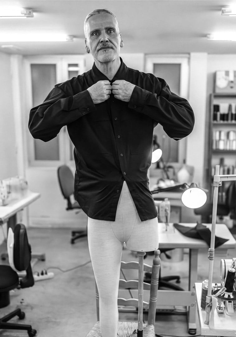 Structure, too, is built by hand. “I give a lot of importance to the upper body, to the shoulders, because that generates everything. It defines the entire structure. I do it this way because I’ve spent many hours in the atelier, learning the craft. I had no money, so I realized that either I did things myself or nothing would happen.” In Alfonso’s work, control is earned. It comes from repetition, from limitation, from having had to do everything himself. From a lifetime of developing a craft under the lens of precision. All that time moves from Alfonso’s hands into the garment. And it lives there, visible, holding the piece together. But for Alfonso, control does not end at the garment itself. It extends far beyond it.