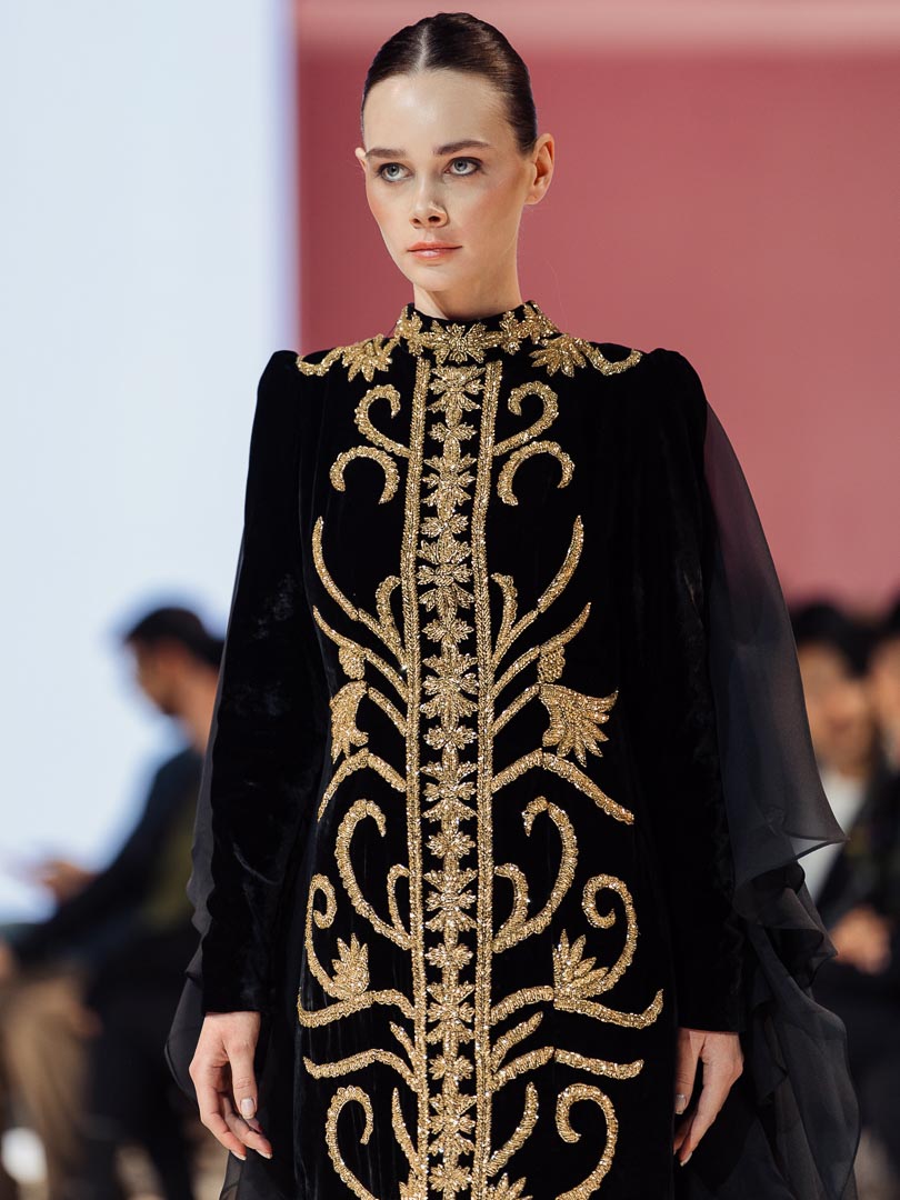 His new collection, Miracle of Gold, clearly reflects this philosophy. The designs draw inspiration from global architecture and the soft intricacy of Eastern ornaments. Each garment feels like a bridge between past and future. Gold embroidery stands out on sumptuous fabrics, the silhouettes are clean and bold, and every look conveys a sense of femininity and quiet confidence.
